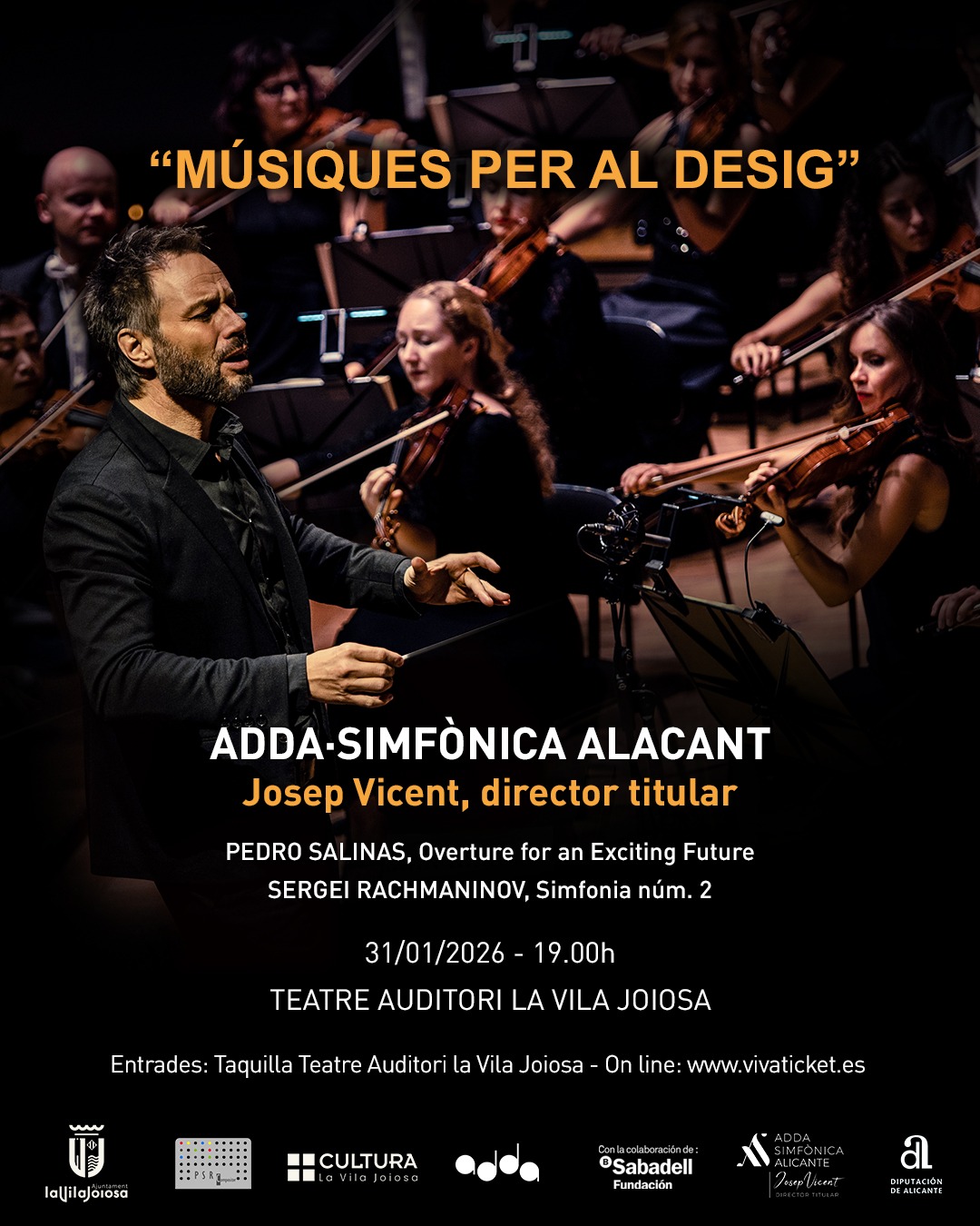 La actuación será a las 19:00 horas bajo la batuta de su fundador y director titular, Josep Vicent. La orquesta estable de la Fundación de la Comunidad Valenciana ADDA ofrecerá una velada que promete despertar “emociones e inspiración” en el público asistente. Esta actuación se enmarca en el programa “ADDA Simfònica als Pobles”, una iniciativa destinada a extender la excelencia musical de la orquesta residente del Auditorio de la Diputación de Alicante por toda la provincia.