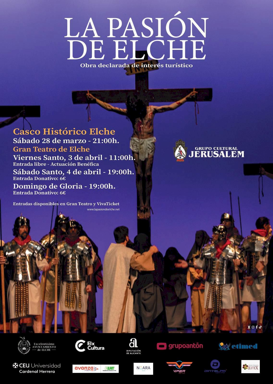 El Ayuntamiento de Elche, a través de la concejalía de Cultura, y el Grupo Cultural Jerusalem han dado a conocer el calendario de actuaciones de La Pasión de Elche, obra declarada de interés turístico provincial.