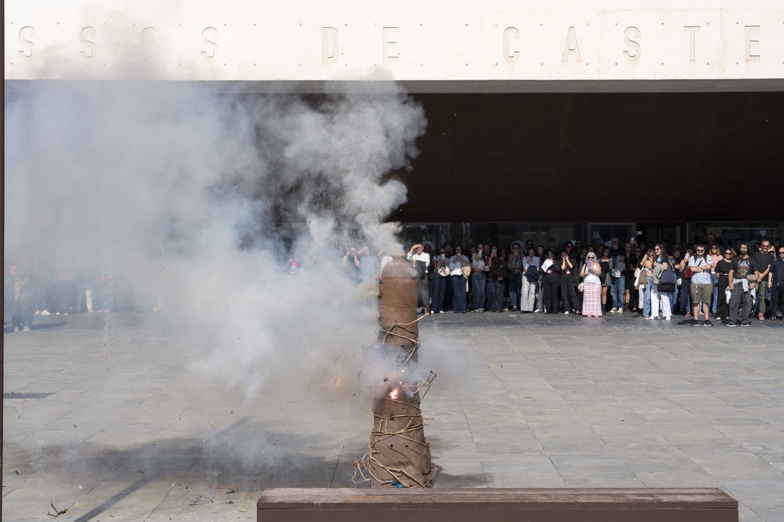 La performance ha finalizado en un gesto de transformación, donde la pieza ha sido devuelta al aire y al sonido en un acto catártico en el que han intervenido el propio artista, el cuarteto de metal y el piano a cuatro manos del Conservatori Superior de Música Salvador Seguí de Castelló, junto con la voz y la palabra del poeta Ángel Benedicte, que acompañaba la acción con un texto creado especialmente para la ocasión, componiendo juntos una sinfonía de tierra, aire y sonido.