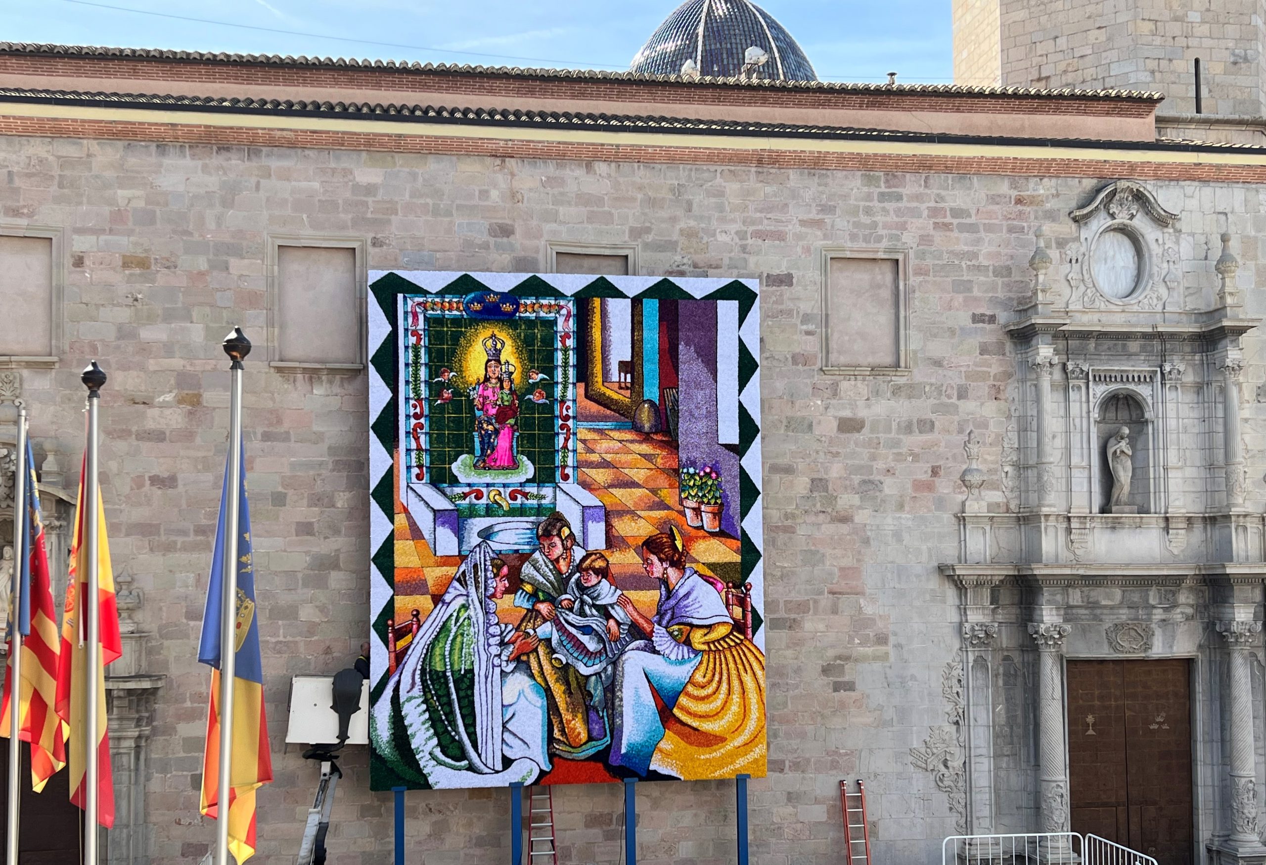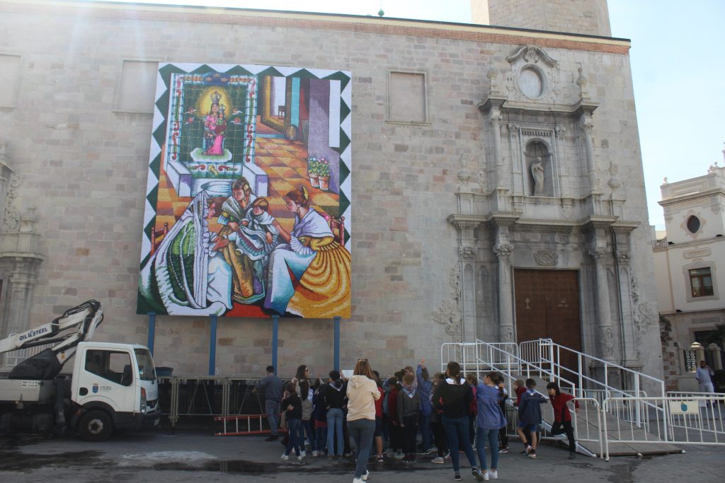 El tapís, amb la patrona de la ciutat com a protagonista, té unes mesures de 9 metres d’altura i 7 d’amplària, i presidirà els actes del lliurament de premis de les falles el dia 16 a la vesprada i l’ofrena el dia de Sant Josep.
