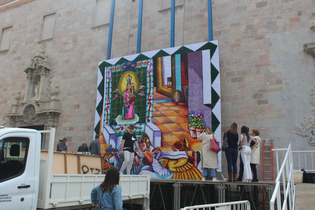 A més, la plaça Major de Borriana ja llueix el tradicional tapís de Falles confeccionat artesanalment amb la tècnica del paper de seda i amb la imatge central de la patrona. La Federació de Falles i l’Ajuntament han completat al llarg d’aquest matí de dilluns el muntatge i la instal·lació de l’obra en honor a la Mare de Déu de la Misericòrdia a la façana de la basílica d’El Salvador, el lloc on culminarà l’ofrena del col·lectiu faller diumenge que ve 19 de març.
