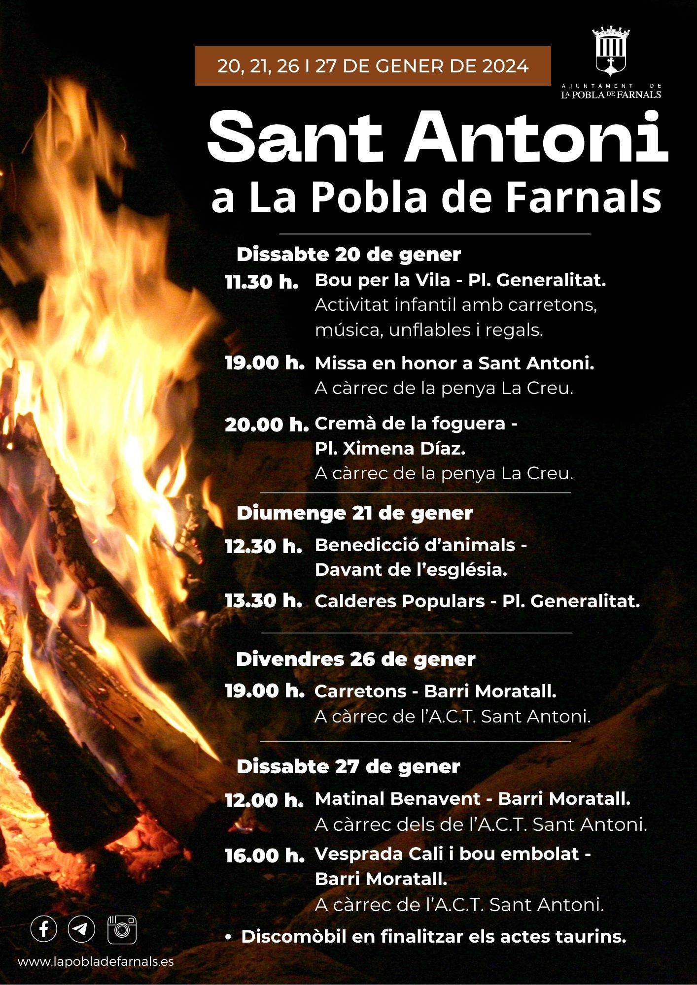 Las fiestas darán inicio el próximo sábado 20 de enero a las 11:30 horas en la plaza Generalitat donde tendrá lugar el ‘Bou per la Vila’, una actividad infantil, organizada por el ayuntamiento de La Pobla de Farnals, con carretones que simularán los ‘bous al carrer’.