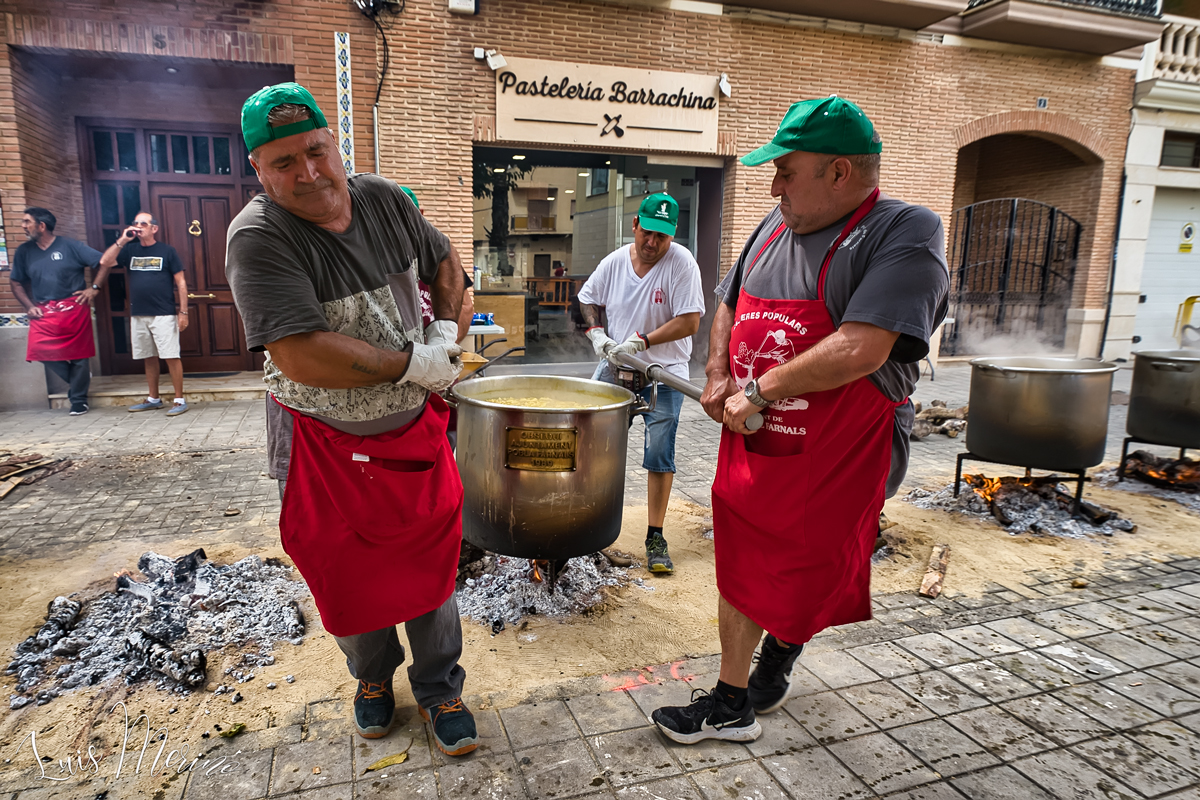 El día del evento, las Calderas se cocinan a fuego lento durante varias horas, utilizando ingredientes de proximidad como arroz, morcillas, chorizos, carne de toro y verduras. Todo este proceso está dirigido por el galardonado maestro calderero Víctor Salvador Iborra, quien lidera al equipo encargado de mantener viva esta tradición y que sin lugar a dudas cada año genera mayor expectativa.