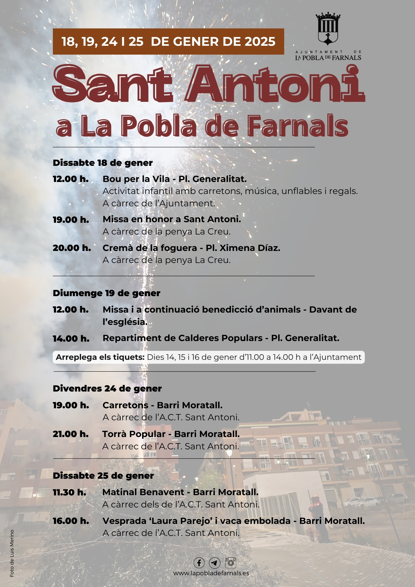 El Ayuntamiento de La Pobla de Farnals, junto con las peñas locales, ha preparado un completo programa festivo para celebrar la festividad de San Antonio Abad 2025. Las actividades comenzarán el sábado 18 y se extenderán hasta el sábado 25 de enero, incluyendo eventos como el “Bou por la Vila”, misas en honor al santo, la bendición de animales y el tradicional reparto de calderas populares.