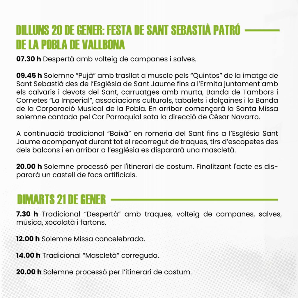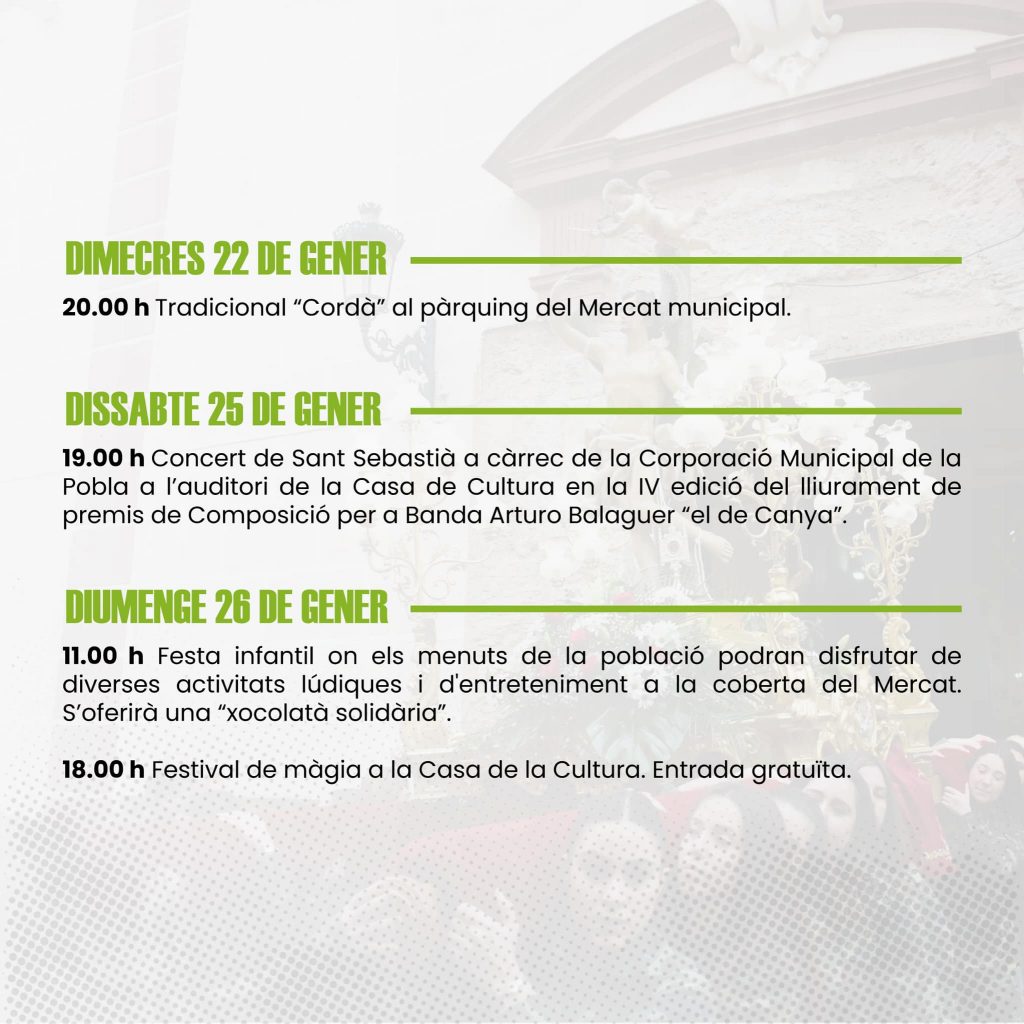 També s’ha organitzat la ‘Cordà’ per al 22 de gener, el concert de Sant Sebastià a càrrec de la Corporació musical de la Pobla per al 25 de gener, en què s’entreguen els premis de Composició per a Banda Arturo Balaguer ‘el de Canya’, i activitats per a la població infantil el 26 de gener.