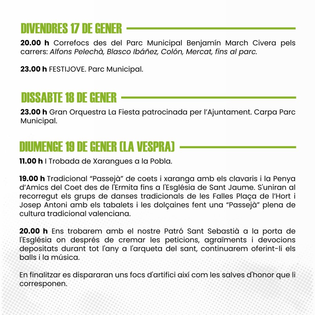 Unes celebracions que s’iniciaran este divendres amb un correfocs des del Parc Municipal Benjamín March Civera i els carrers Alfonso Pelechá, Blasco Ibáñez, Colón, Mercat fins a tornar a arribar al Parc Municipal. A la nit, serà el torn del ‘FestiJove’ en la carpa situada al parc municipal. Els actes seguiran el dissabte, 18 de gener, amb l’actuació de l’orquestra ‘La Fiesta’ en la carpa habilitada al Parc Municipal.