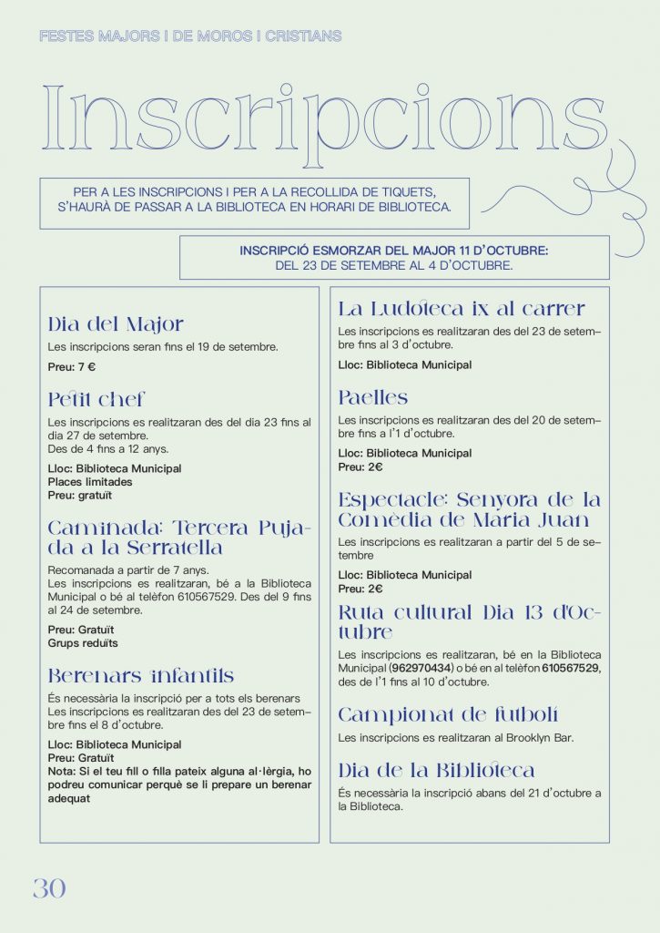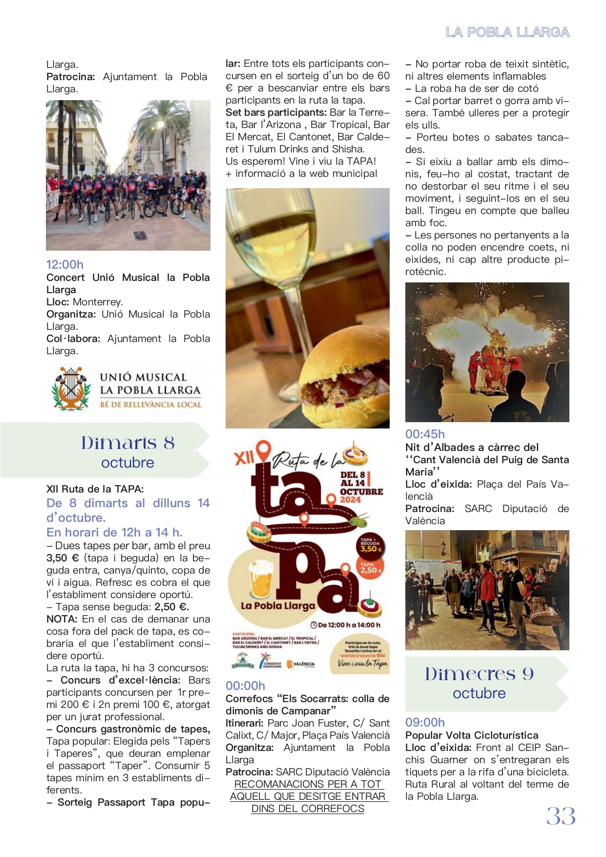 A més, el 5 d’octubre, es va realitzar l’acte de les paelles, un acte que agafa importància i atrau més participants i visitants. També cal destacar la famosa Ruta de la Tapa, que arriba a la seua dotzena edició, la qual s’inicia el dia 8 d’octubre promet ser un dels grans atractius per als amants de la gastronomia. Aquest any tindrem l’oportunitat de gaudir d’una espectacular mascletada nocturna i focs artificials el dia 9 d’octubre.