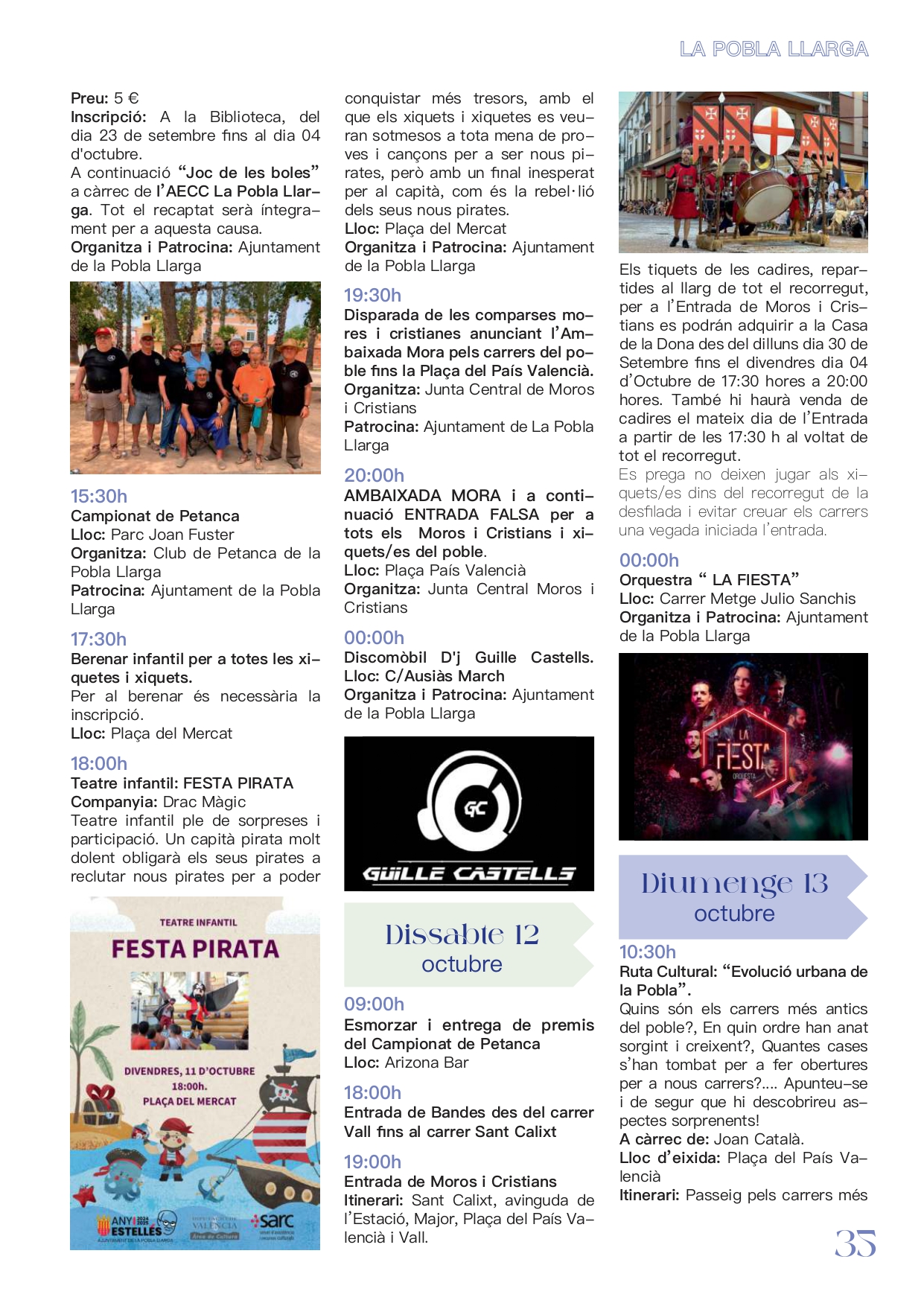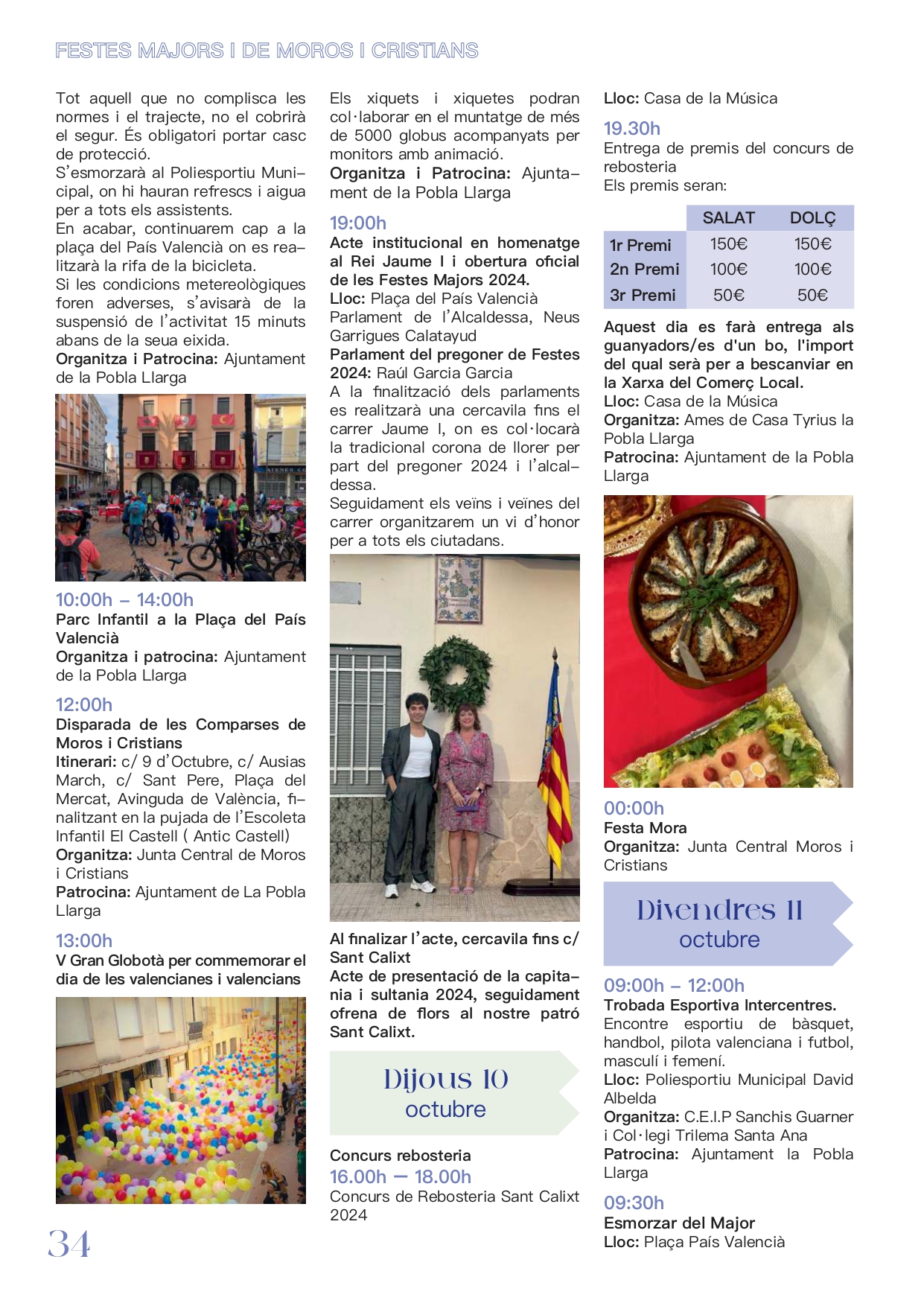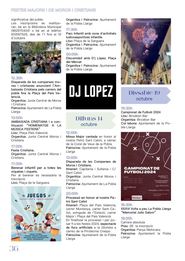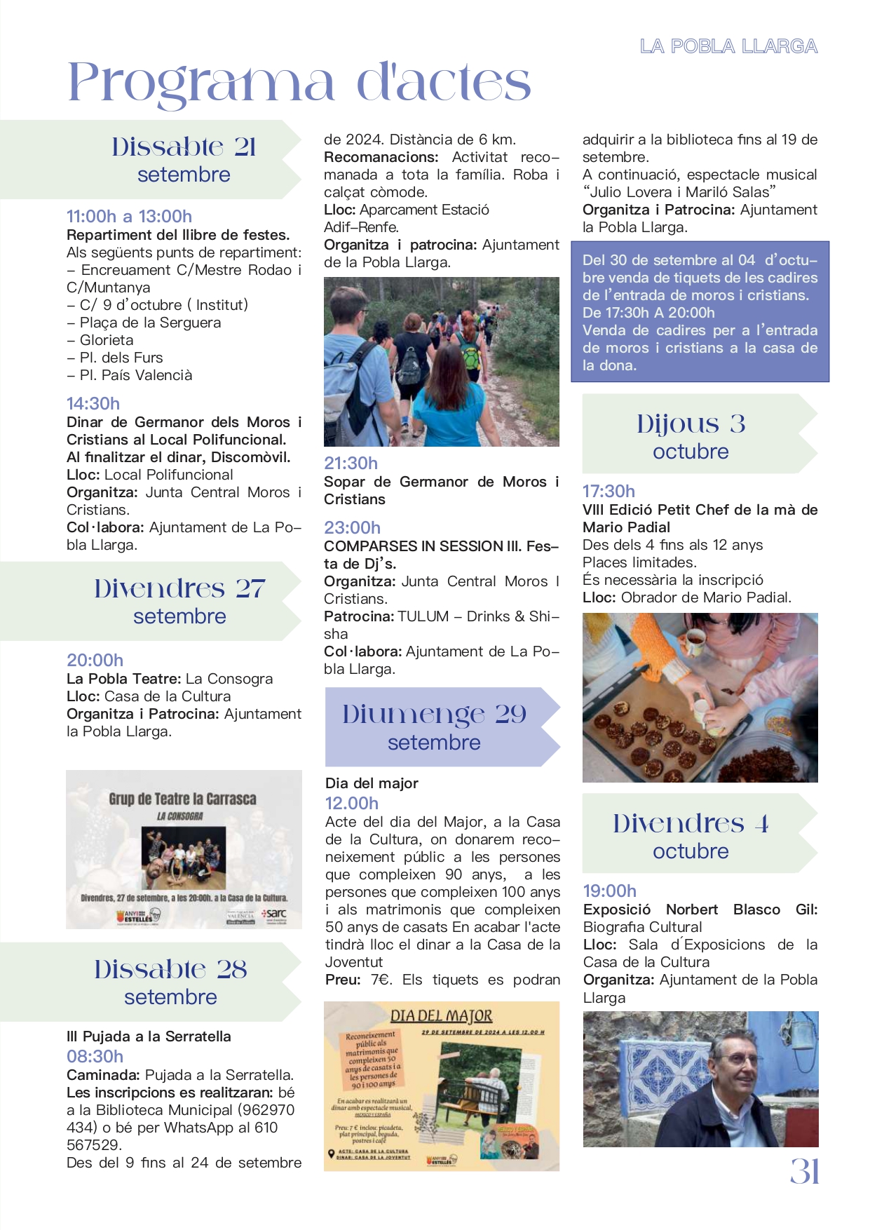 Del 4 al 14 d’octubre, els carrers de la Pobla Llarga s’ompliran de vida amb una oferta variada que inclou activitats culturals, esportives i gastronòmiques per a totes les edats. Els més menuts gaudiran de parcs infantils, mentre que els amants de la tradició no es voldran perdre les albades, correfocs i, per descomptat, l’emocionant Entrada de Moros i Cristians, que tindrà lloc el 12 d’octubre.