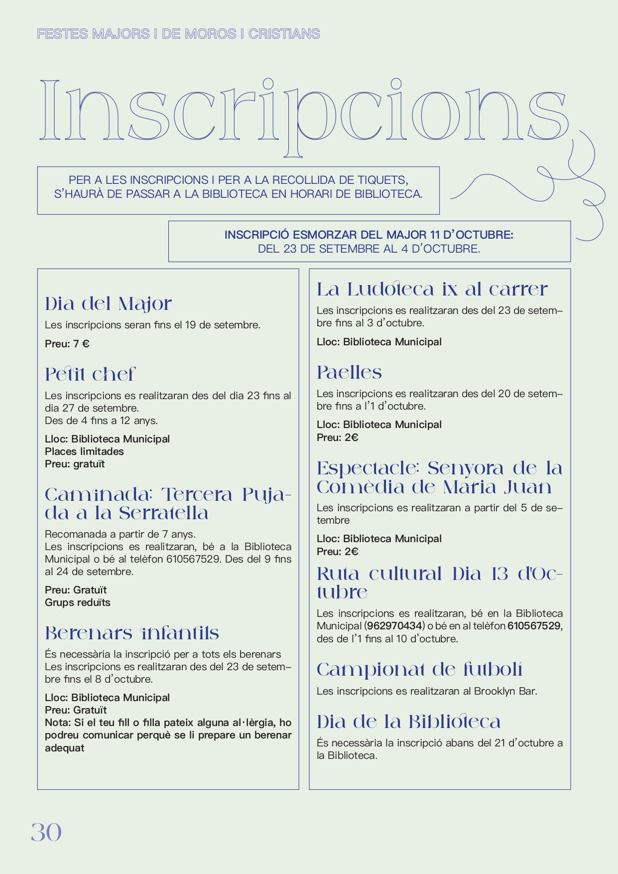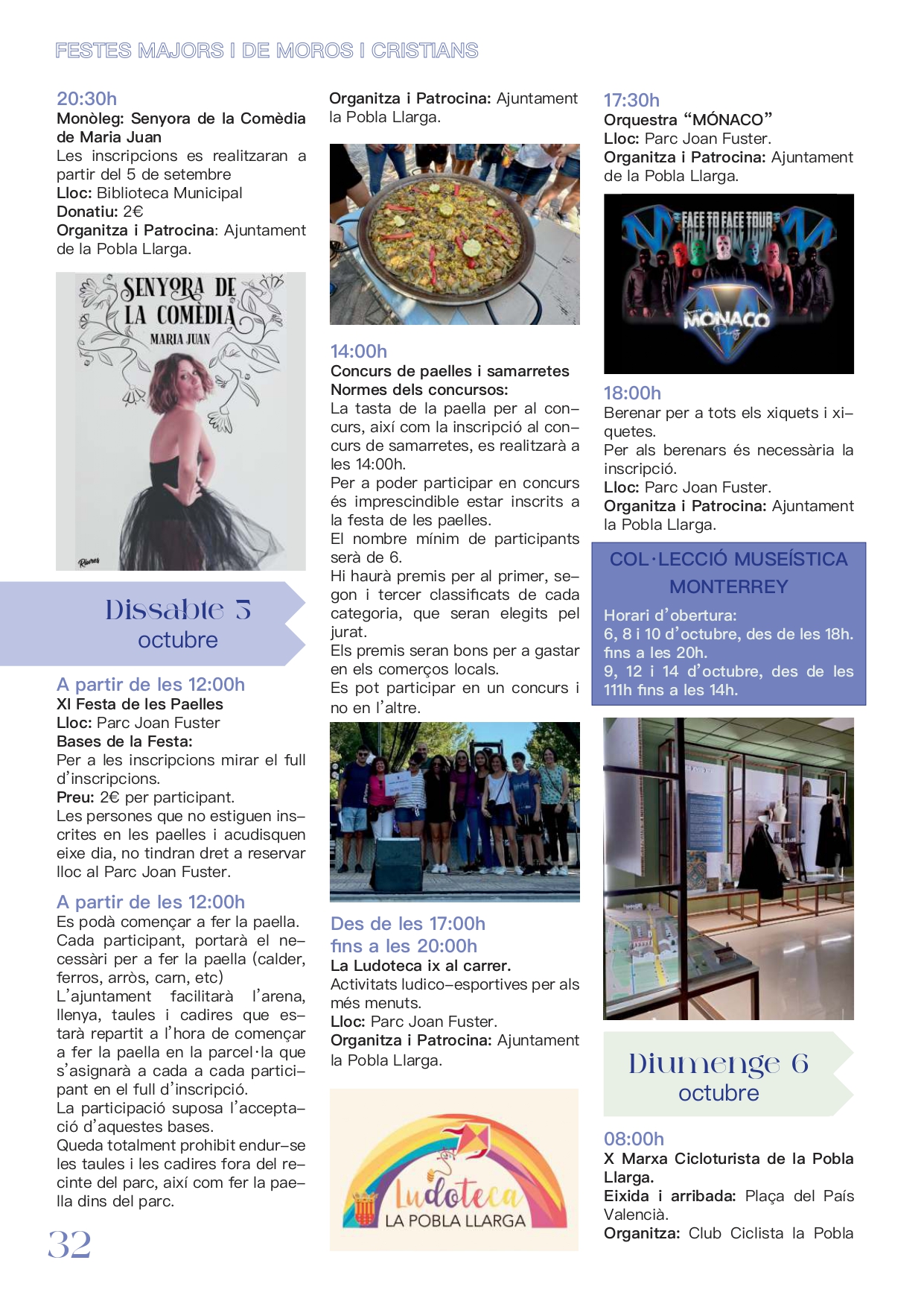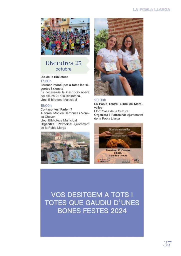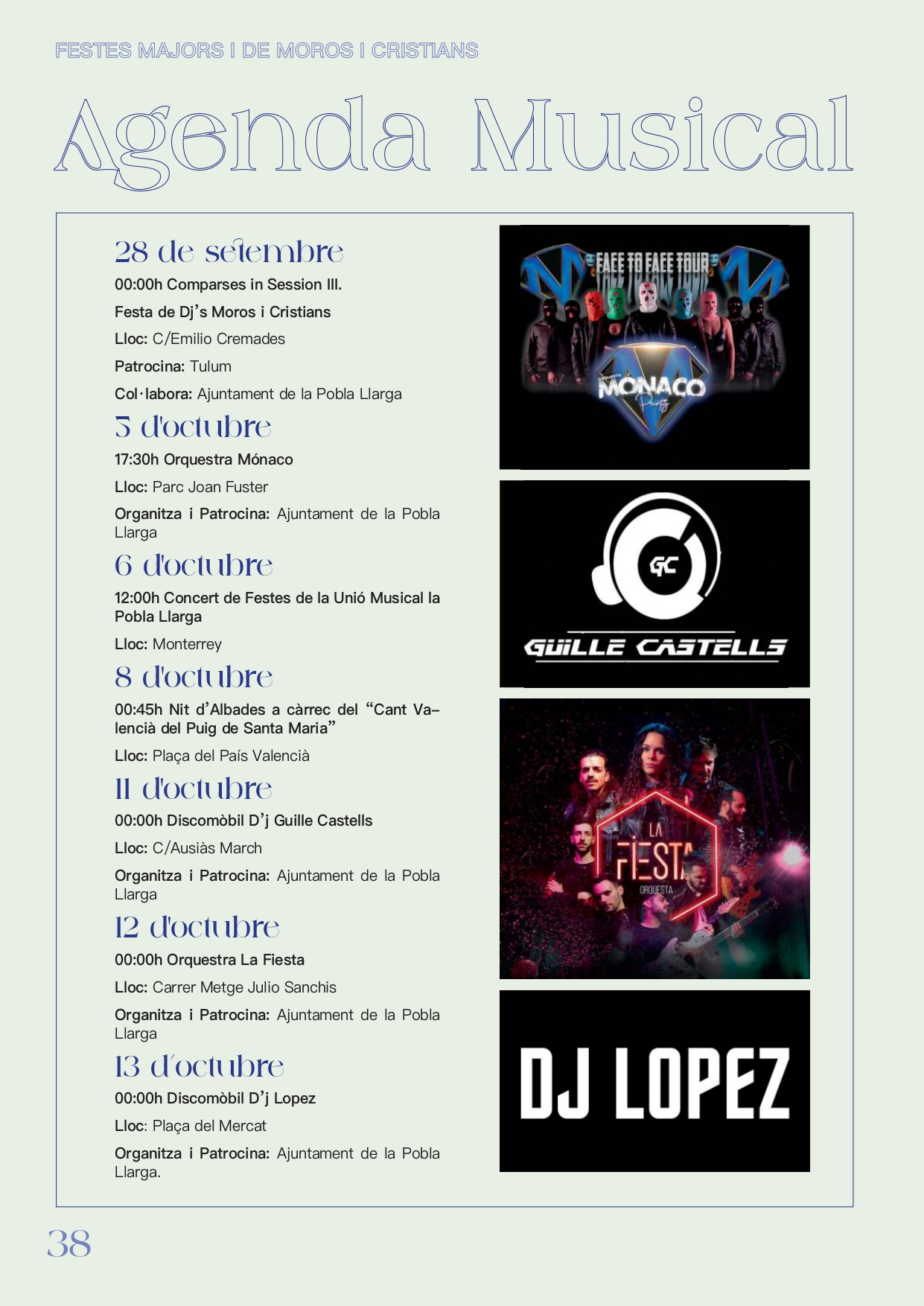 Del 4 al 14 d’octubre, els carrers de la Pobla Llarga s’ompliran de vida amb una oferta variada que inclou activitats culturals, esportives i gastronòmiques per a totes les edats. Els més menuts gaudiran de parcs infantils, mentre que els amants de la tradició no es voldran perdre les albades, correfocs i, per descomptat, l’emocionant Entrada de Moros i Cristians, que tindrà lloc el 12 d’octubre.