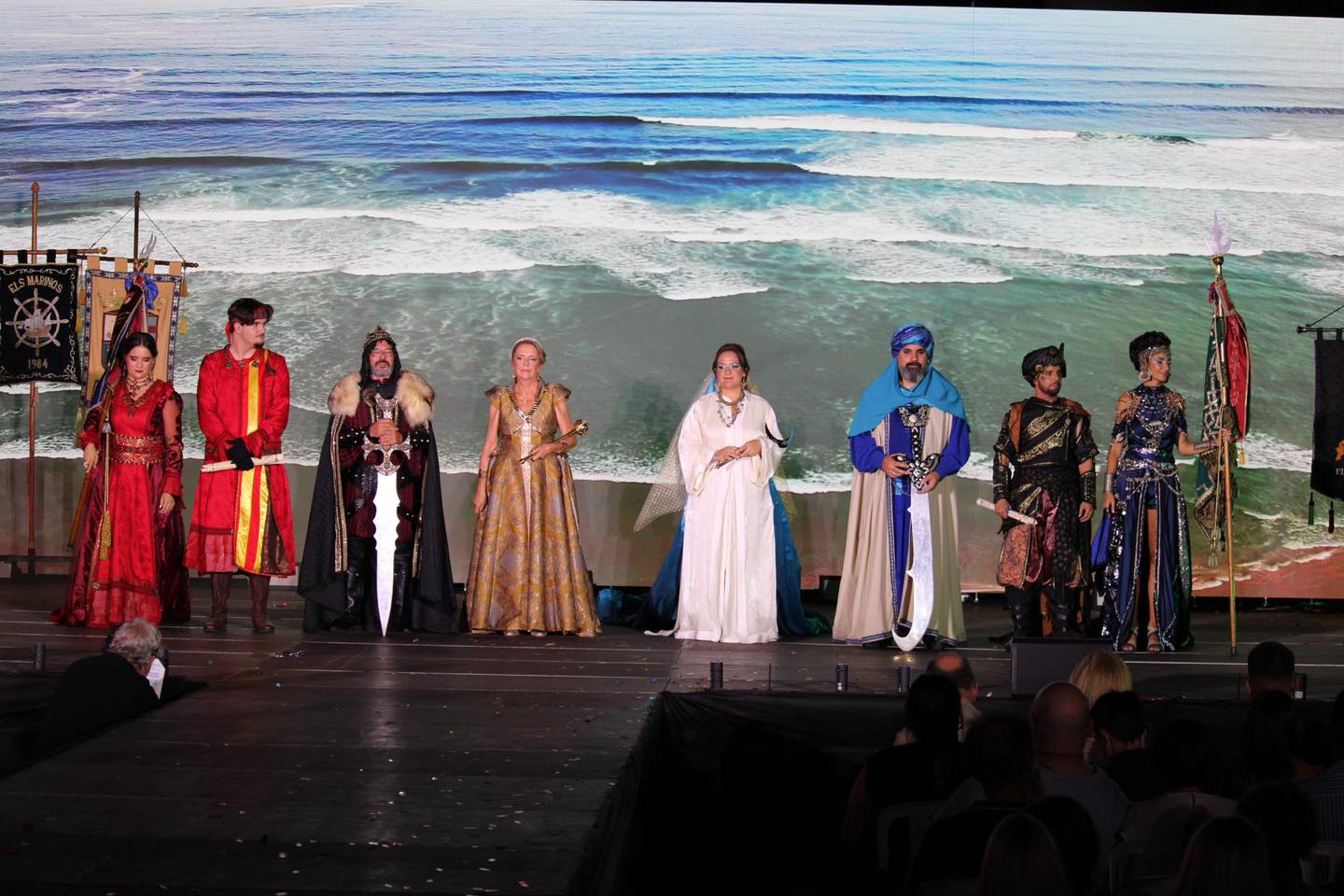 Recinto lleno, estandartes bien relucientes, cargos en su papel representativo, música festera por partida doble (la banda L’Harmonía de Alicante y la Colla Larraix de El Campello), muixaranga, senyera, nanos i gegants, cuerpos de baile listos para entrar en escena, presentadores Cristina Boix y Pere Lluís Gomis con el guion del evento bien aprendido, representantes de todos los sectores cívicos, efectivos de la Policía Local y protección Civil velando por la seguridad de todos, representante de la UNDEF (el vicepresidente Julián Fernández) y autoridades municipales en su sitio… y mucho bullicio inicial, que cesó en seco cuando el sonido de una sirena de barco anunciaba que el acto empezaba.