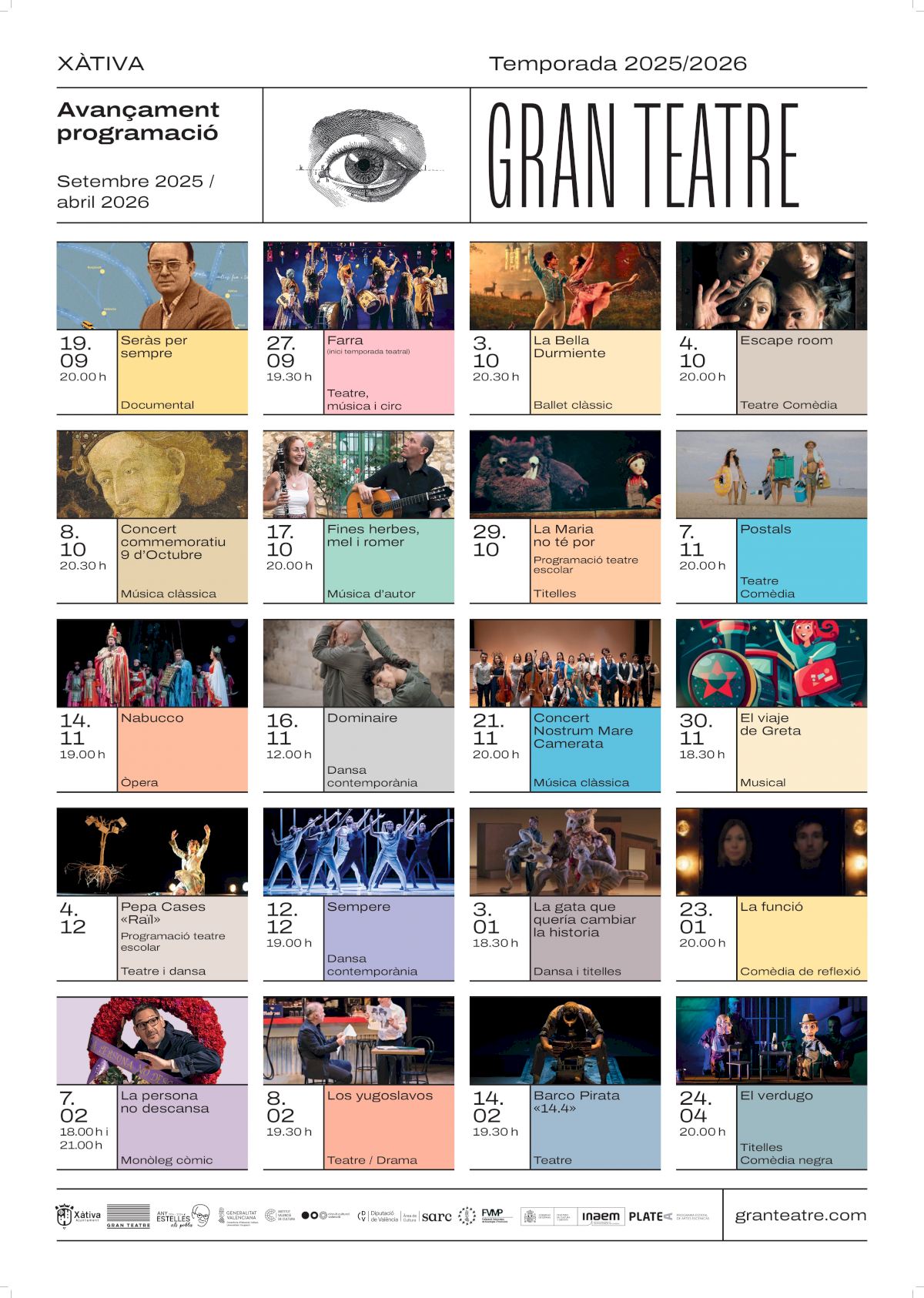 Per a la resta d’obres i espectacles s’anunciarà pels canals oficials de l’Ajuntament de Xàtiva i el Gran Teatre la seua posada a la venda més endavant.