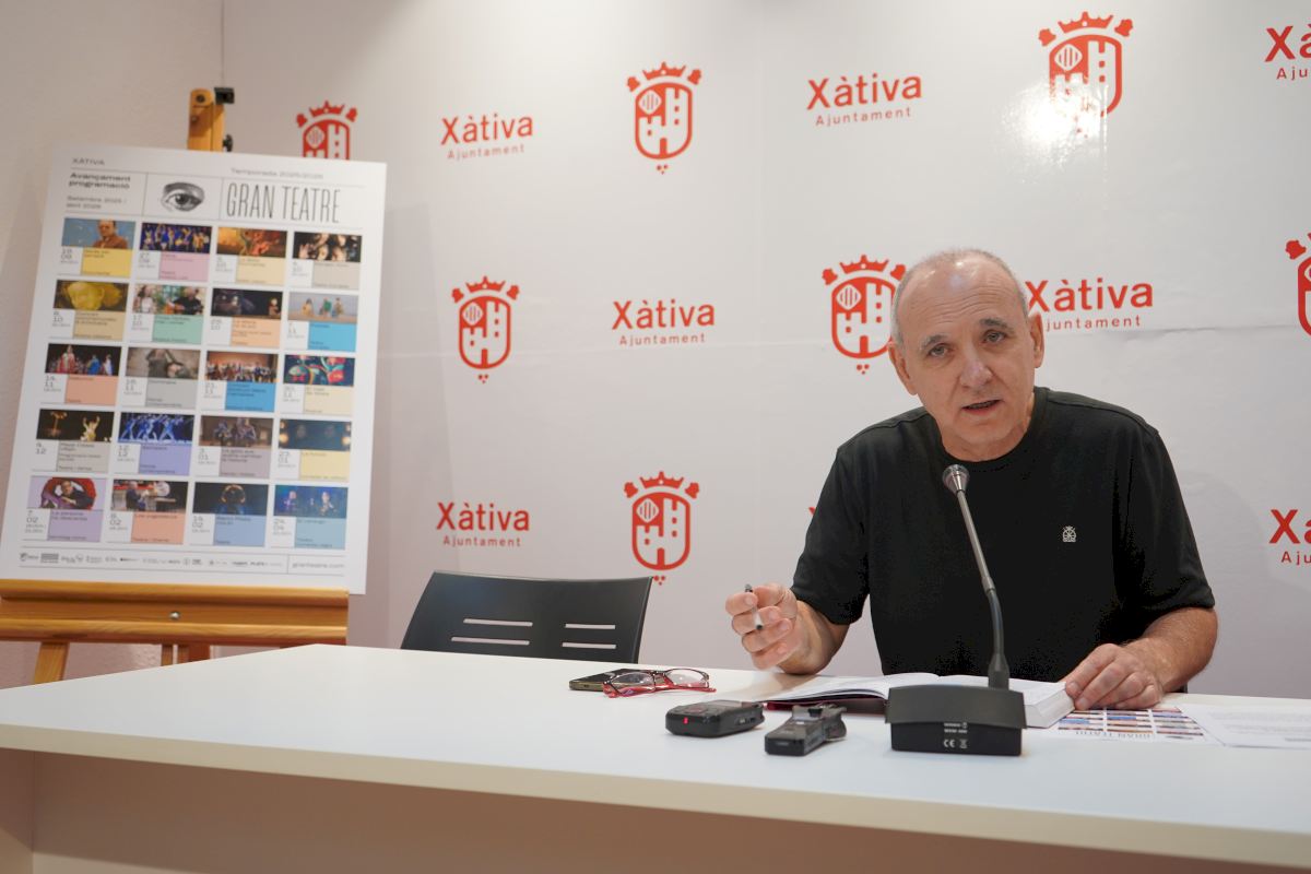 Aquest matí s’ha presentat a l’Ajuntament de Xàtiva la programació del Gran Teatre de Xàtiva per a la temporada 2025/2026, la qual comptarà amb més d’una vintena de cites confirmades entre setembre i abril que compta amb el suport del Programa PLATEA del Ministeri de Cultura, a la Diputació de València-SARC, de l’Institut Valencià de Cultura-Circuit Cultural Valencià, i de la Conselleria d’Educació, Cultura, Universitats i Ocupació amb el programa del foment del valencià en l’àmbit local.