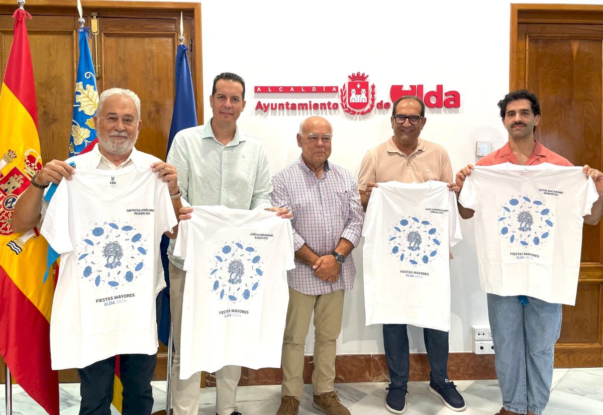 Por otra parte, el alcalde de Elda, Rubén Alfaro; el concejal de Fiestas, David Guardiola, y el pregonero de las Fiestas Mayores 2024, Juan Pascual Azorín, han recibido esta mañana de manos de Ramón González, presidente de la Cofradía de los Santos Patronos, la camiseta y el pañuelo personalizados para ‘correr la traca’. Hay que recordar que la ilustración de la camiseta es obra del artista eldense Héctor Sanz, que también ha estado presente en el acto.