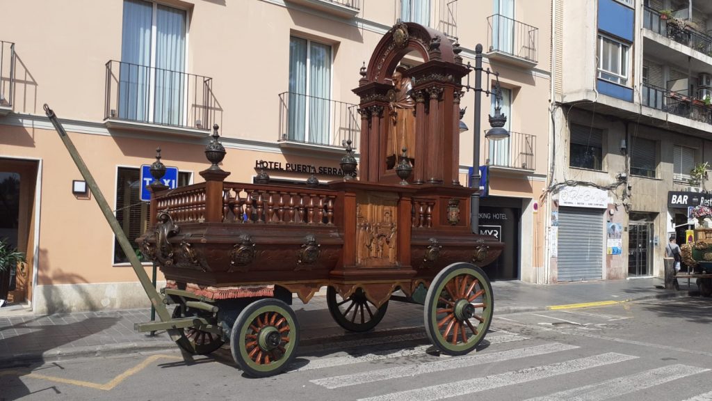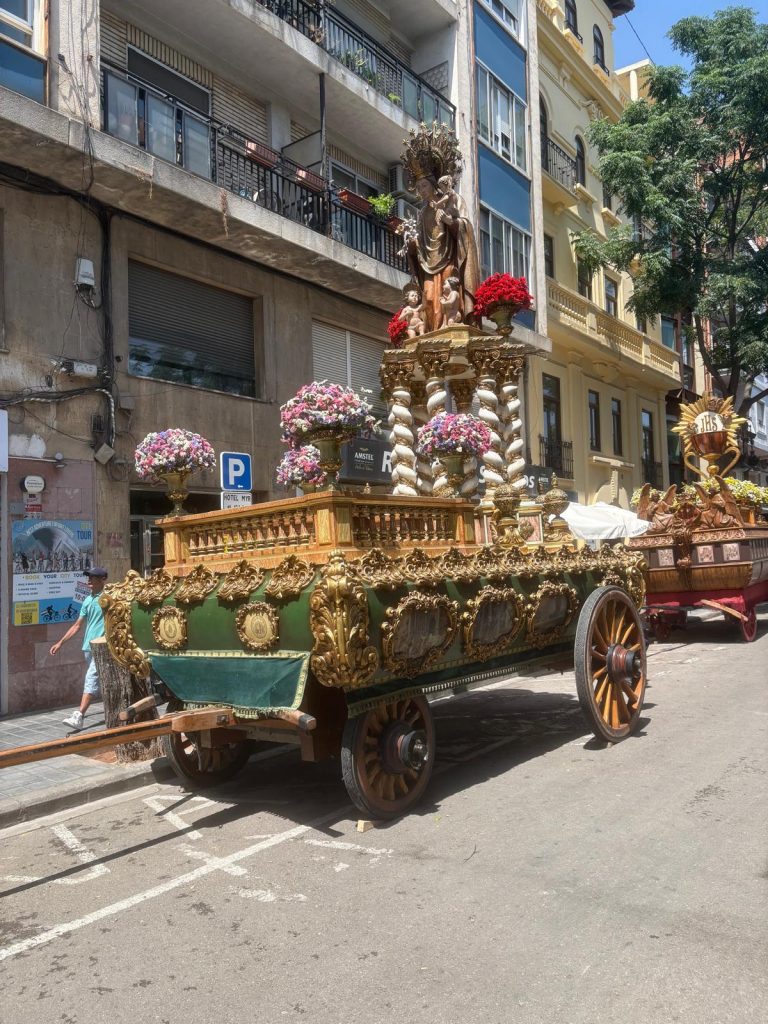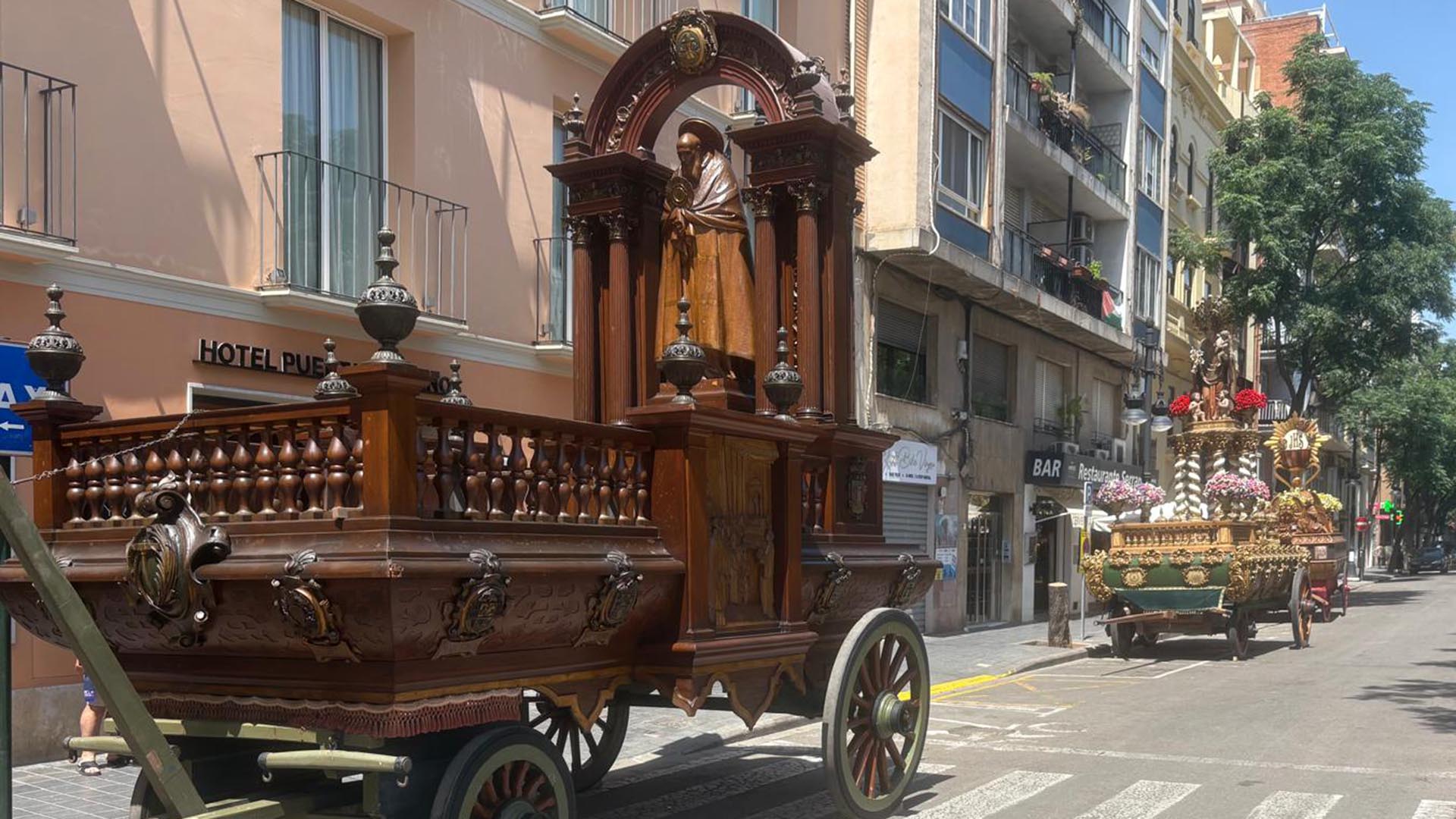 Con el inicio de la fiesta del Corpus Christi, el bestiario, San Cristóbal y las Rocas empiezan a tomar las calles de la ciudad. A primera hora de este viernes, los carros triunfales de ‘La Virgen’, el ‘Santo Cáliz’ y ‘El Patriarca’ salían de la Casa de les Roques para quedar expuestas en las Alameditas de Serranos hasta que esta misma tarde, a las 20 horas, sean trasladadas a la plaza de la Mare de Déu, donde aguardarán hasta el domingo 22.