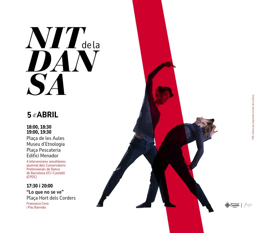 La primera de las citas será a las 17.30 horas, en la Plaza Hort dels Corders, con el espectáculo “Lo que no se ve” a cargo de Francesca Cova y Pau Barreda. Esta intervención se volverá a repetir a las 20.00 horas en el mismo espacio. Tras esta primera perfomance tomarán el testigo, a partir de las 18.00 horas, las coreografías en Plaza de las Aulas, Museo Etnológico, Plaza Pescadería y Edificio Menador, cada media hora. María España ha destacado que “el año pasado emprendimos un camino de no retorno, para situar la danza en el lugar donde se merece. Un espacio destacado dentro de nuestra oferta cultural y el espacio que merecen sus alumnos, profesores o aficionados. La danza es una de las formas más antiguas y universales de expresión que existen. Y eso es lo que queremos, que la danza salga a la calle y tiene un diálogo con el público castellonense”.