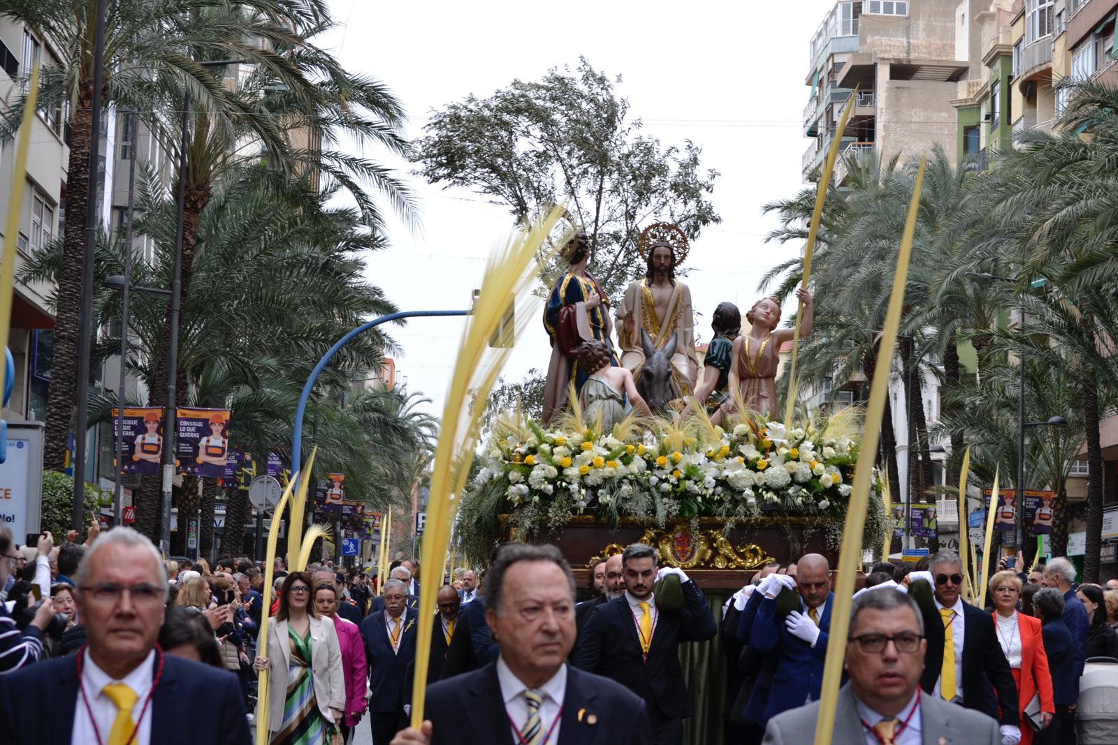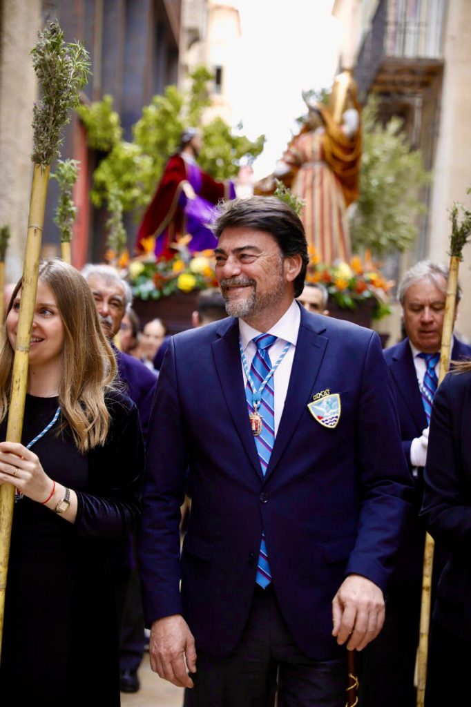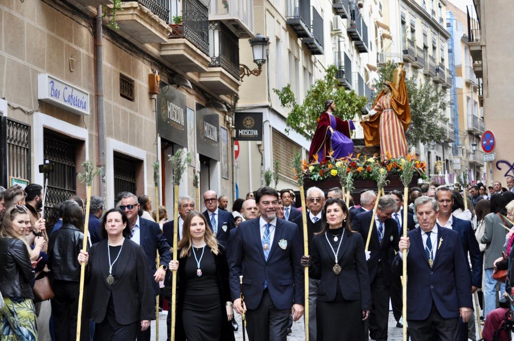 Cuarenta y siete costaleros han sido quienes han portado, en los distintos relevos, el paso de ‘La Burrita’ desde la avenida de la Estación a la Plaza del Ayuntamiento. Hacía 57 años que no se veía esta imagen por las calles de Alicante, después de que en 1958 fuera la última vez que procesionó a varal. Las cinco figuras, originales de José Seiquer Zanón y que han sido restauradas este año al igual que el trono, lo han hecho escoltadas por ciudadanos portando palmas con ramas de olivo, alusivas al momento de la entrada de Jesús en Jerusalén. Las concejalas Mari Carmen de España, Cristina Cutanda y el edil Antonio Peral han figurado en la comitiva.