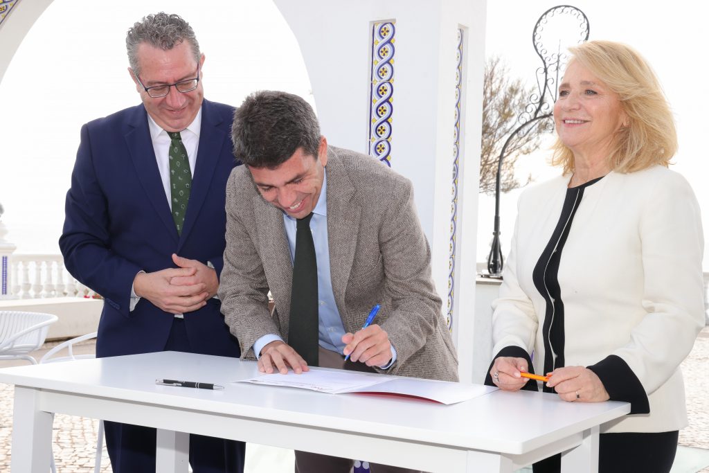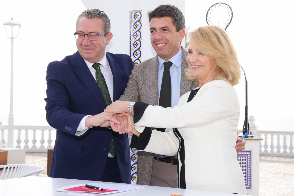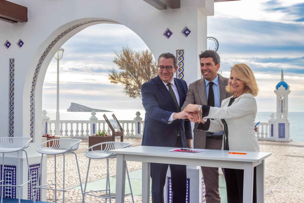 La Plaça del Castell de Benidorm ha sido este jueves el escenario elegido para dar el pistoletazo de salida oficial a la tercera edición del Benidorm Fest, el certamen organizado por Radio Televisión Española, la Generalitat Valenciana y el Ayuntamiento de Benidorm para elegir al artista que representará a España en la próxima edición del festival de Eurovisión. El alcalde de la ciudad, Toni Pérez; el presidente de la Generalitat Valenciana, Carlos Mazón; y la presidenta de RTVE, Elena Sánchez, han formalizado la firma del convenio a tres bandas con la que las tres instituciones ratifican su colaboración en este evento, que celebrará sus dos semifinales los días 30 de enero y 1 de febrero y la gran final, el sábado, 3 de febrero, desde el Palau d’Esports l’Illa de Benidorm. Junto a ellos también han participado en el acto la consellera de Innovación, Industria, Comercio y Turismo de la Generalitat, Nuria Montes; los diputados autonómicos Manuel Pérez Fenoll y Mario Villar; numerosos ediles de la Corporación Municipal, así como una nutrida representación de la sociedad civil de Benidorm.