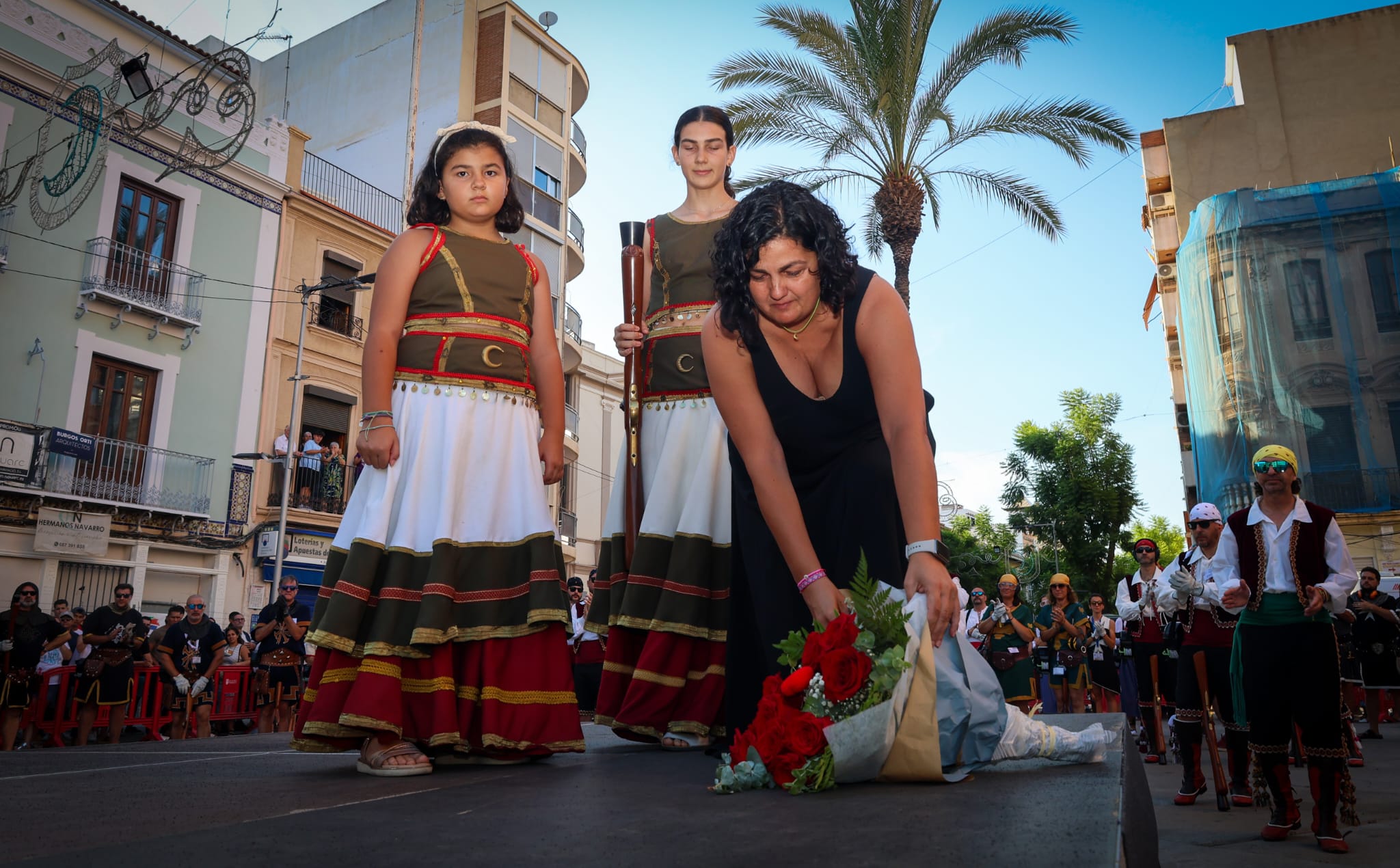 Pero la jornada no fue solo festiva. En uno de los momentos más emotivos del día, las comparsas y filaes rindieron un sentido homenaje póstumo a Diego Herreros, quien fuera Capitán Cristiano en 2008 por la Filà Contrabandistas. Un disparo de honor, acompañado por un respetuoso silencio y la presencia de familiares y amigos, llenó de emoción la Plaza Mayor. El instante más simbólico llegó cuando las hijas de Diego ofrecieron su trabuco a Nicko Magán, compañero de su misma filà, en un gesto cargado de recuerdos y afecto.