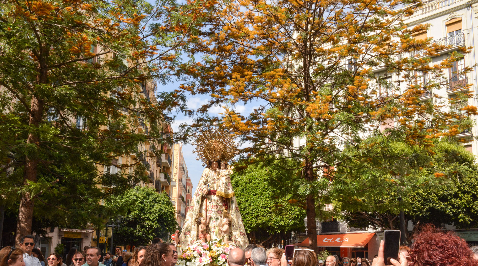 La imagen de la Virgen de los Desamparados que se venera en la parroquia de San Valero Obispo y San Vicente Mártir ha salido este sábado, por primera vez después de 40 años, por el barrio de Ruzafa para visitar colegios, fallas, comercios y el propio Mercado, para sumarse a las celebraciones del Centenario de la Coronación de la Mare de Déu.