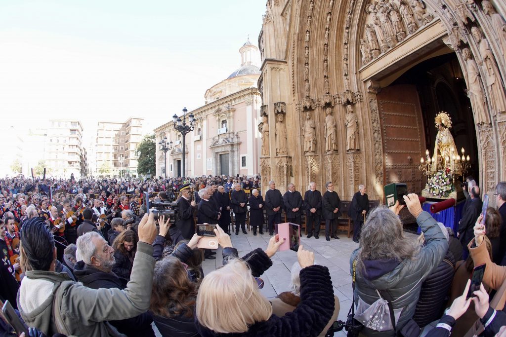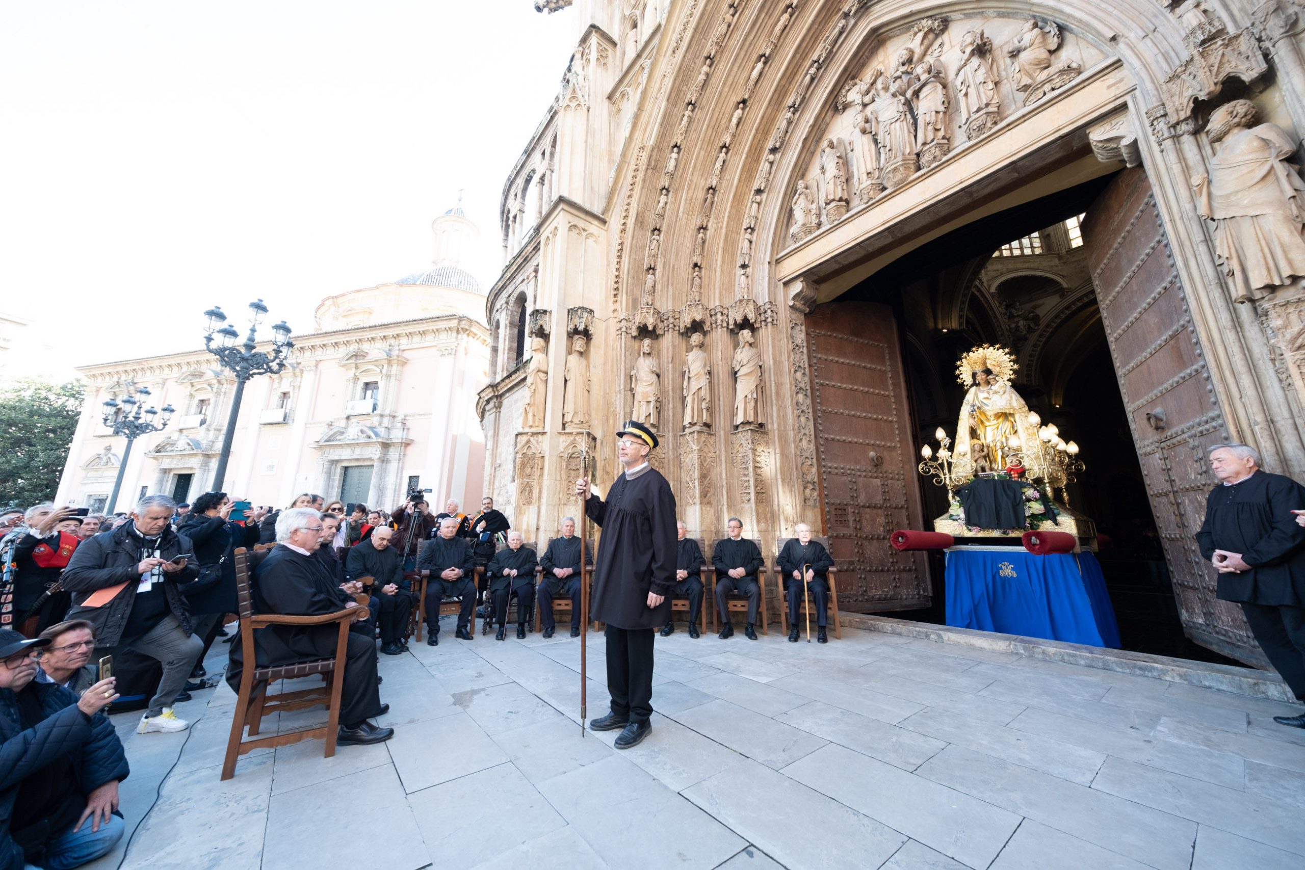 A las doce del mediodía, cuando sonaban las campanas del Micalet, se ha abierto la Puerta de los Apóstoles de la Seo donde la imagen peregrina de la Virgen esperaba el comienzo de la sesión judicial, y ha sido recibida con calurosos aplausos, en una mañana gélida, del numeroso público presente y con una lluvia de pétalos desde los balcones de la vecina Casa Vestuario, sede del Tribunal de las Aguas.