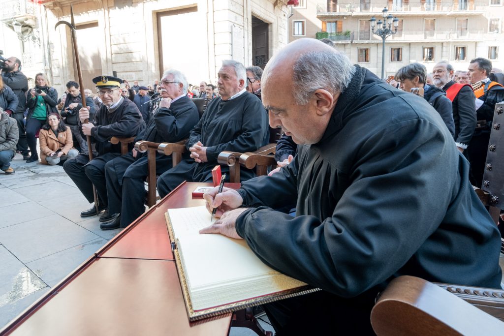 El Arzobispo de Valencia ha firmado el Libro de Oro del Tribunal de las Aguas con la siguiente dedicatoria en valenciano: “Gràcies per esta distinció que és per a mi un gran honor. Que la Mare de Déu continue inspirant en els membres del Tribunal de les Aigües sentiments de justícia i siga protecció de tots els llauradors de l’horta i de les seues famílies”.