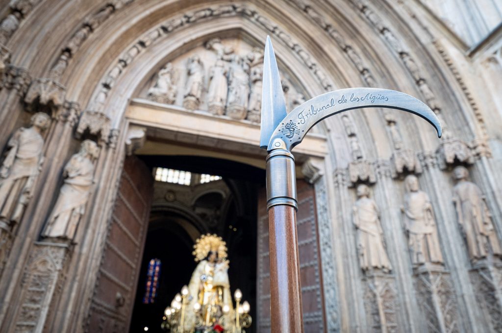 La Virgen de los Desamparados ha presidido hoy, jueves, por primera vez en la historia del Tribunal de las Aguas de la Vega de Valencia, una sesión judicial de esta institución valenciana milenaria, celebrada de forma especial con motivo del Centenario de la Coronación Canónica de la Mare de Déu.