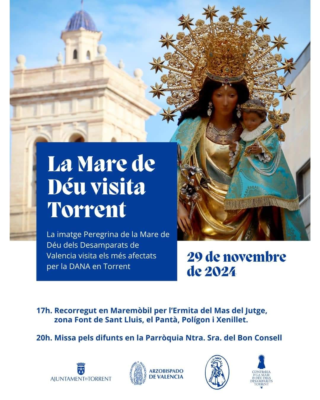 Monseñor Enrique Benavent ha autorizado, la visita de la virgen peregrina a las zonas afectadas de Torrent, esta procesión tan especial para el municipio, llevará consuelo a los vecinos afectados por la DANA. A través de la Hermandad de Seguidores de Nuestra Señora de los Desamparados, comprometida con la devoción a la Virgen desde 1948, cumpliendo este año 76 años de su fundación. Se encargan de honrar, difundir y custodiar la imagen, acompañando los traslados de la Virgen Peregrina y promoviendo la advocación mariana fuera de la Basílica, facilitando su acercamiento, tanto a los fieles de localidades de la Comunitat Valenciana, como fuera de ella, llevando un mensaje de fe, esperanza y caridad de nuestra patrona.