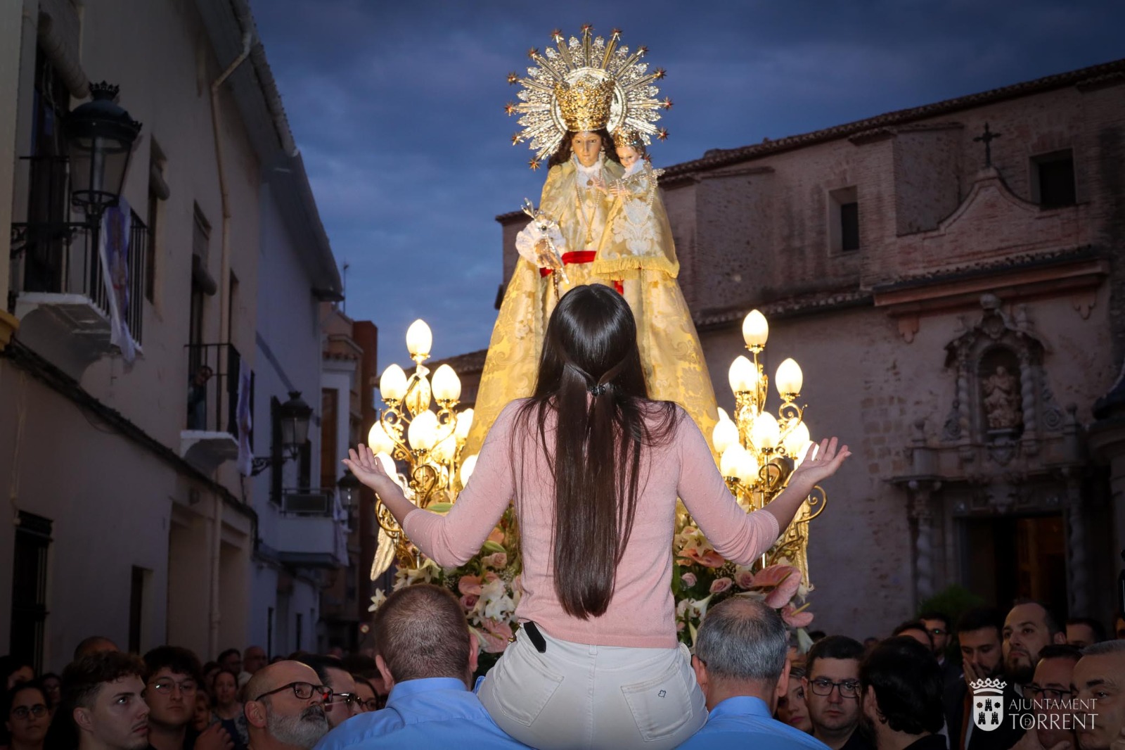 Destaca la parada en el antiguo Ayuntamiento de Torrent, donde la Virgen es considerada alcaldesa perpetua y donde recibió las poesías de las Falleras Mayores de la ciudad, María y Vega, la Reina del Encuentro, Mariola Garrido, y la Musa de la Música, María González. Las representantes de la ciudad, junto a las Cortes de Honor de las Falleras Mayores y la alcaldesa, Amparo Folgado, lanzaron pétalos a la patrona desde los balcones del antiguo Ayuntamiento en la calle Ramón y Cajal, 7. Al igual que tras la procesión del domingo, los actos finalizaron con fuegos artificiales ofrecidos por Fireworks Star Caballer® & Sanmartin de Villamarxant.