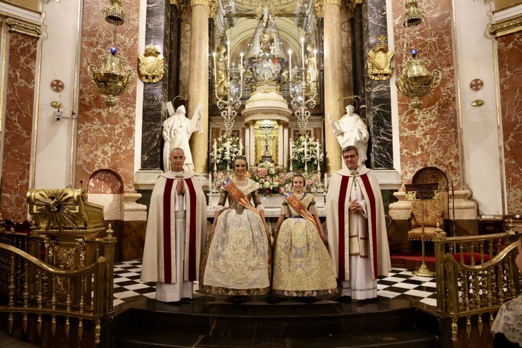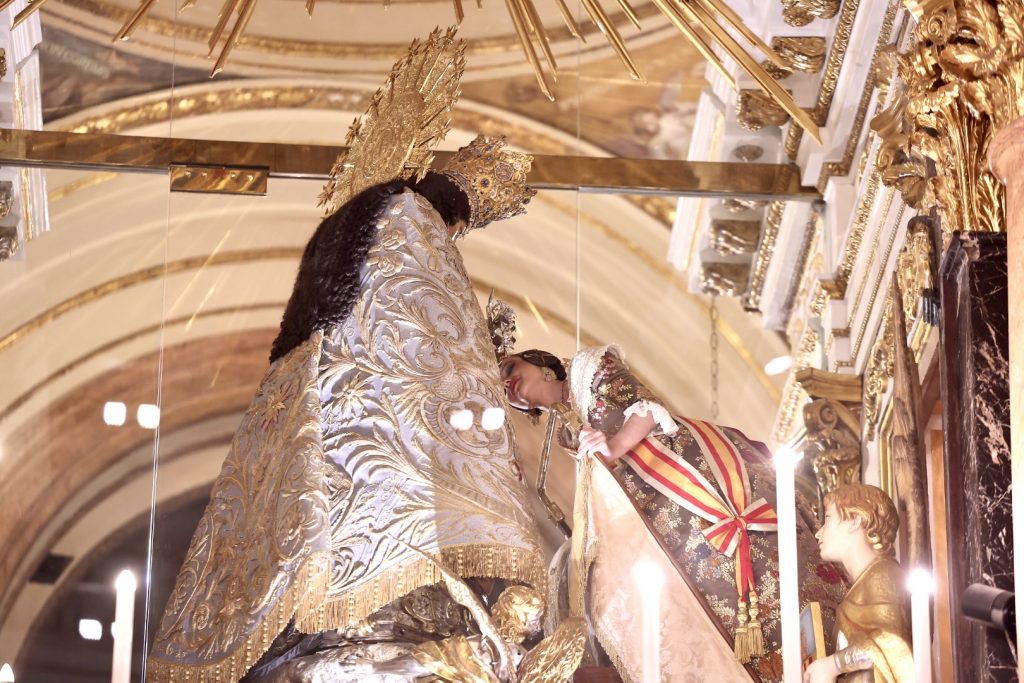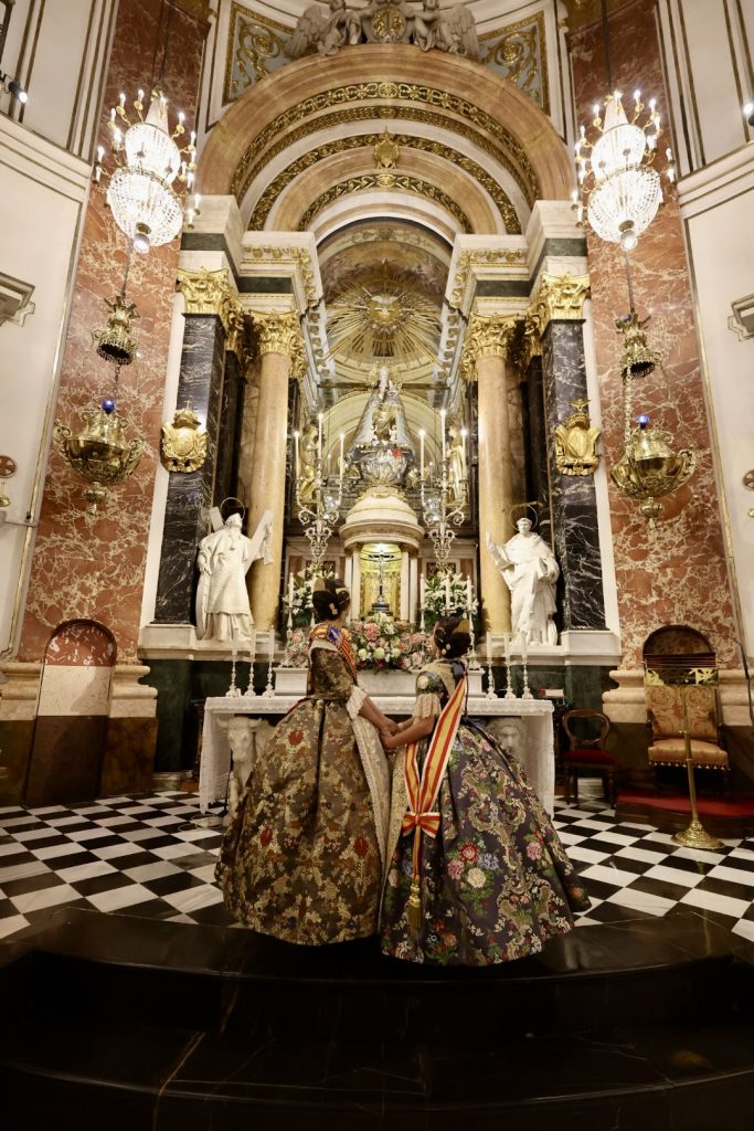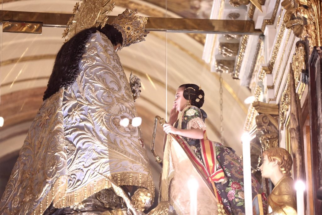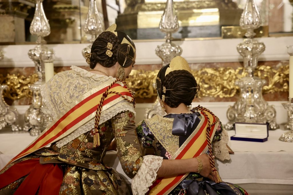 Les Corts d’Honor que ja amb les seues bandes, recentment estrenades en les exaltacions, van ofrenar els seus rams a l’altar major d’una en una i van dedicar mirades d’agraïment a la patrona. Després d’este moment i d’una breu cerimònia, Mª Estela i Marina van passar al camarí de la Verge, on trencades d’emoció van compartir un moment íntim amb ella, omplint-la de besos i paraules murmurades.