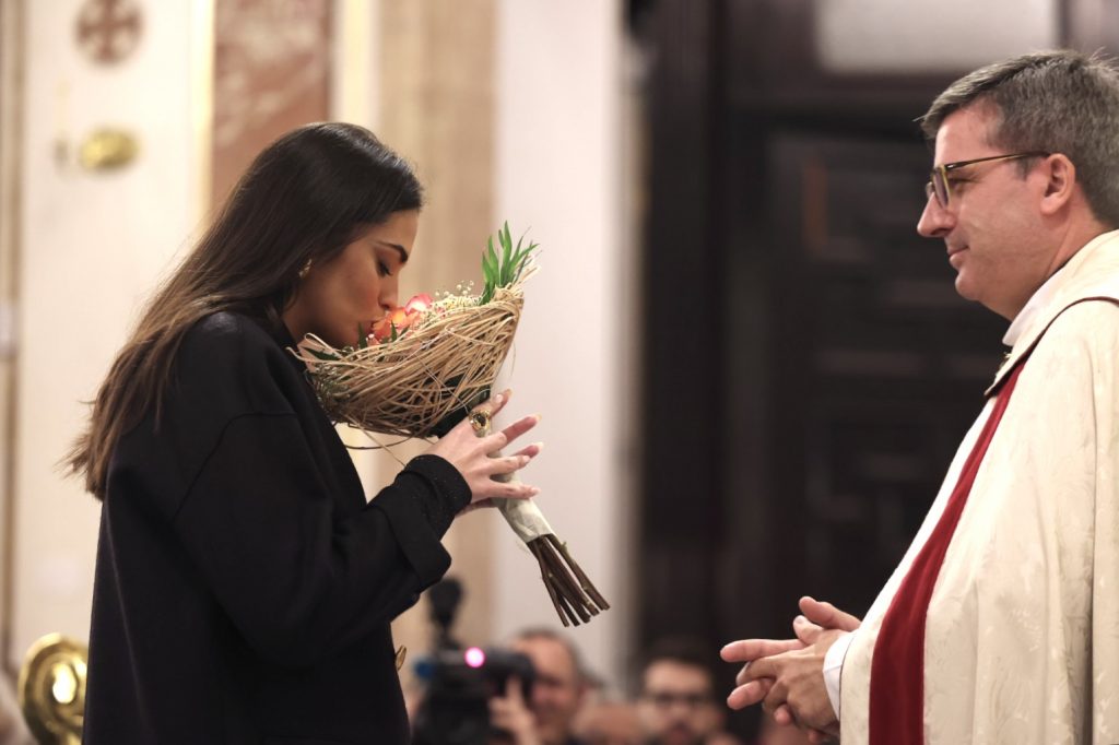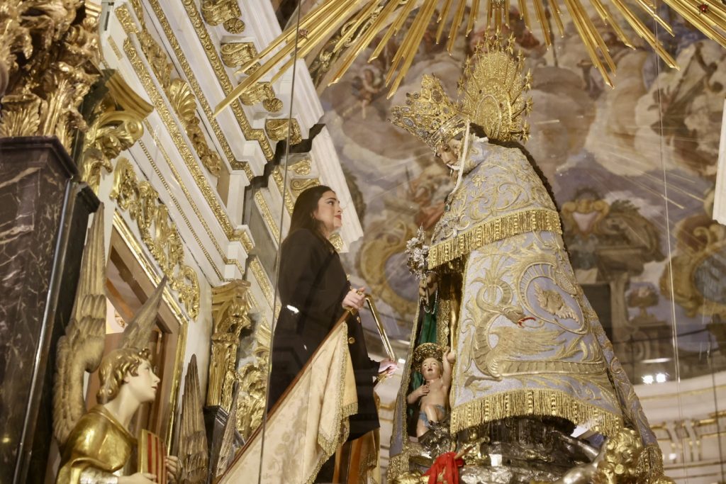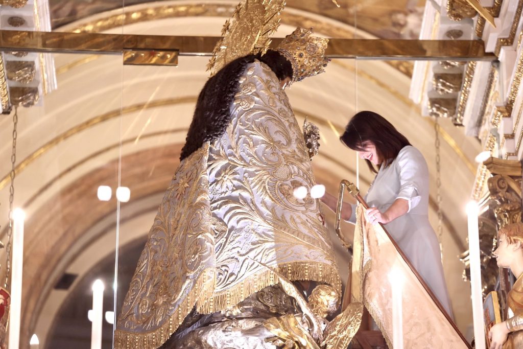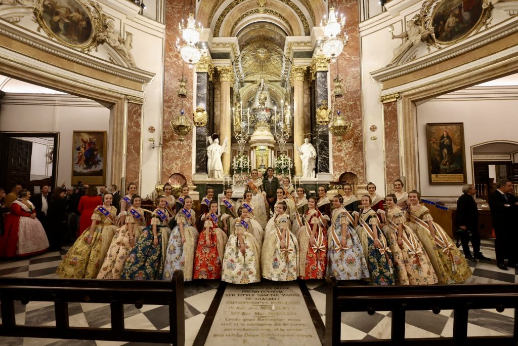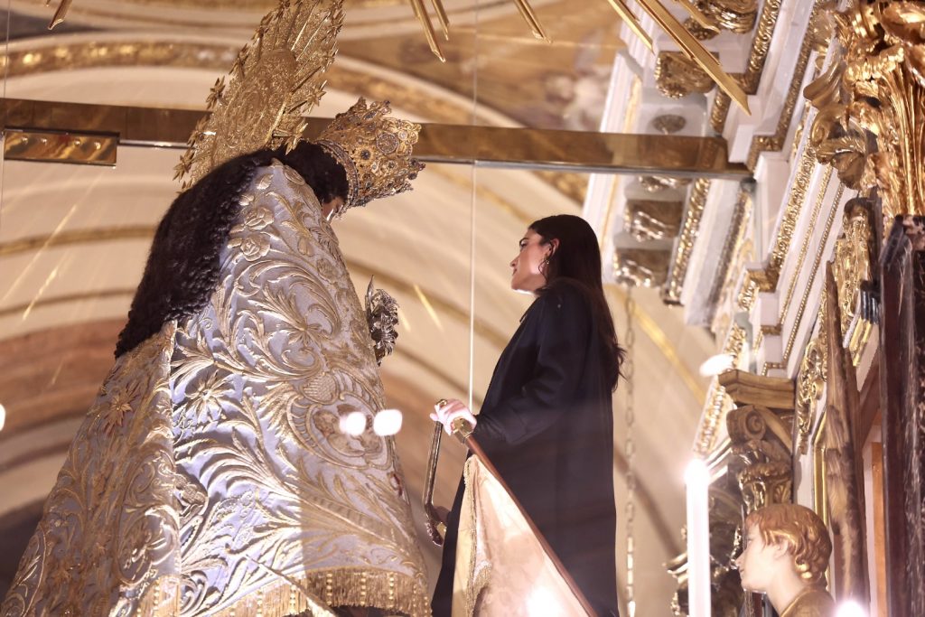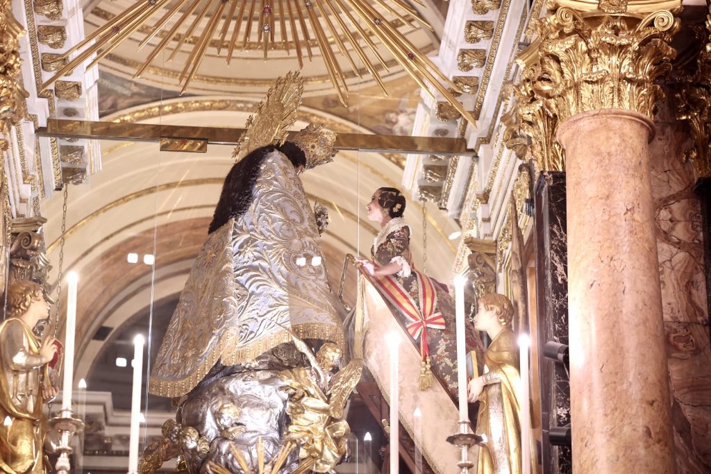 Les Corts d’Honor que ja amb les seues bandes, recentment estrenades en les exaltacions, van ofrenar els seus rams a l’altar major d’una en una i van dedicar mirades d’agraïment a la patrona. Després d’este moment i d’una breu cerimònia, Mª Estela i Marina van passar al camarí de la Verge, on trencades d’emoció van compartir un moment íntim amb ella, omplint-la de besos i paraules murmurades.