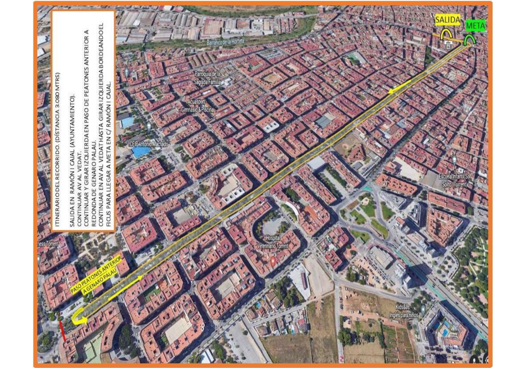 El recorrido, totalmente urbano, será de 3.080 metros con salida y meta, situadas en calle de Ramón y Cajal, a la altura del ayuntamiento. Continua por la Avenida al Vedat hasta llegar al paso de peatones anterior a la rotonda de Genaro Palau, donde haremos un giro a izquierda para continuar por la Avenida al Vedat dirección ficus, y girar hacia la calle de Ramón y Cajal hasta llegar a meta.
