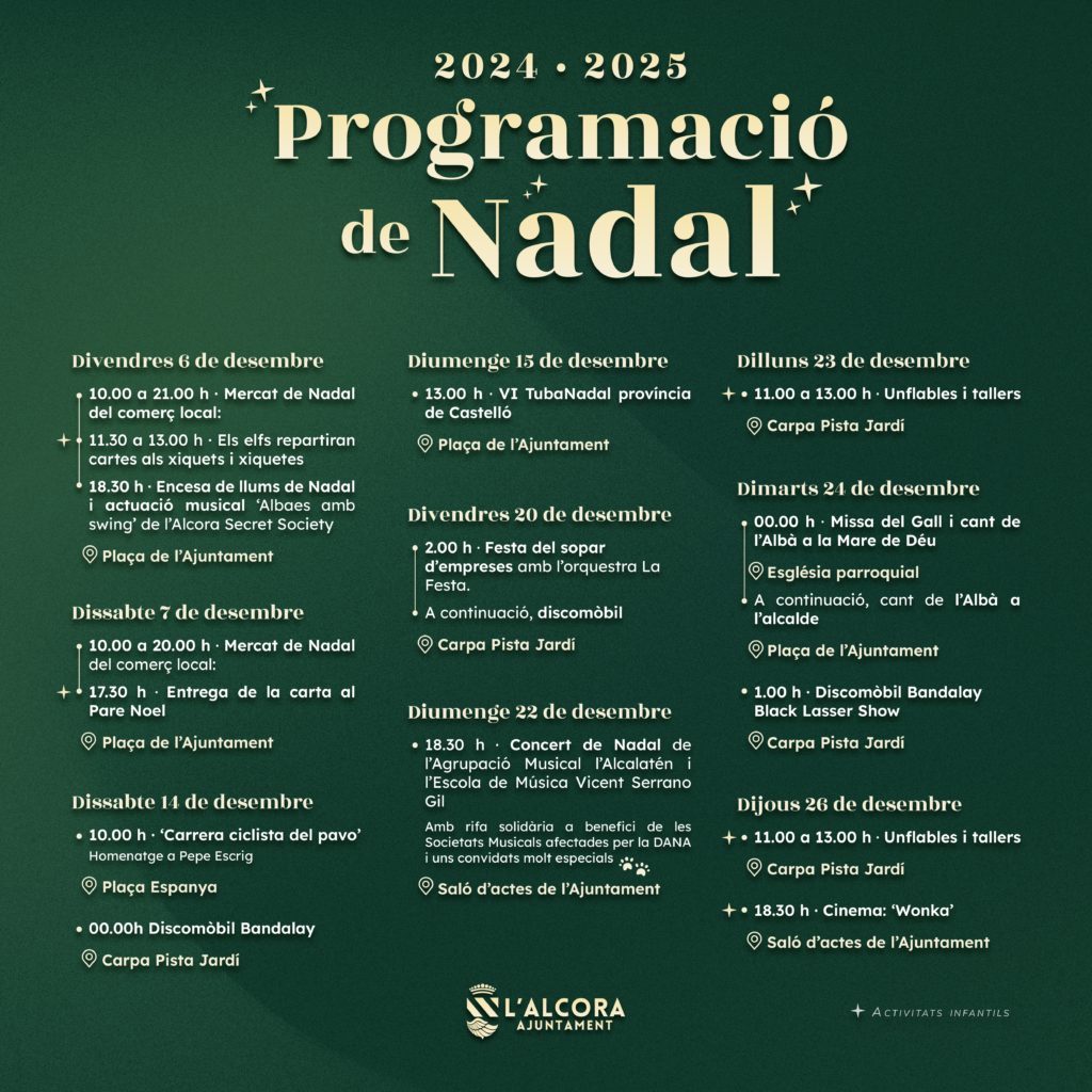 Mercat de Nadal (6 i 7 de desembre): el comerç local serà protagonista a la plaça de l’Ajuntament amb un mercat replet de productes, propostes úniques i un ambient nadalenc immillorable. Inclourà l’encesa de les llums, la visita del Pare Noel i l’actuació musical ‘Albaes amb swing’ de l’Alcora Secret Society, entre altres sorpreses.