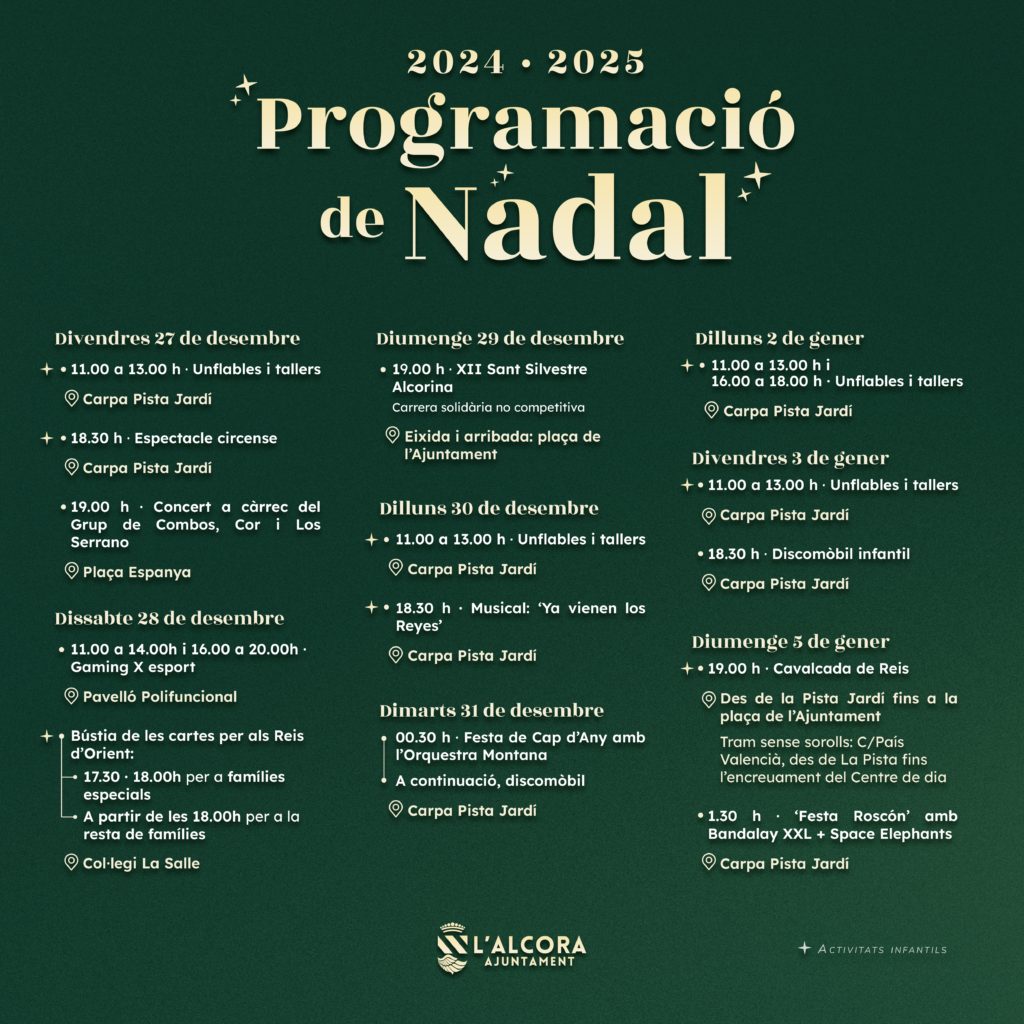 L’Alcora ja està preparada per a celebrar el Nadal sense estar-se de res, amb una programació dissenyada perquè veïns i visitants visquen unes festes inoblidables. Enguany, el municipi s’ompli de llum, música i activitats pensades per a tots els públics, assegurant que ningú es quede sense gaudir en aquestes dates tan especials.