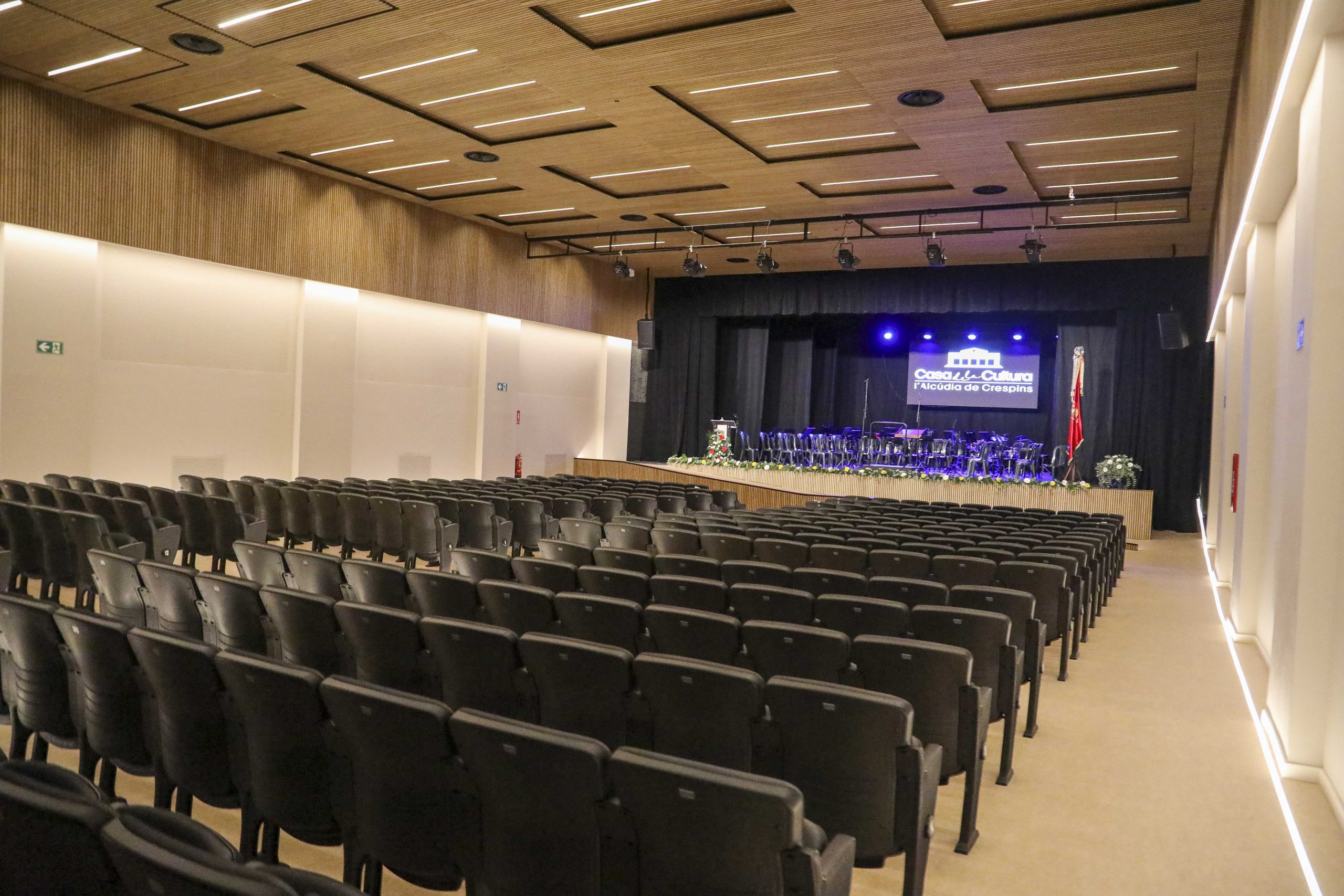 Addicionalment, la sala s’ha equipat tècnicament amb material d’última tecnologia: s’ha creat un sistema de so i enllumenament, s’ha vestit la sala amb nous telons i s’han instal·lat noves pantalles i projectors.