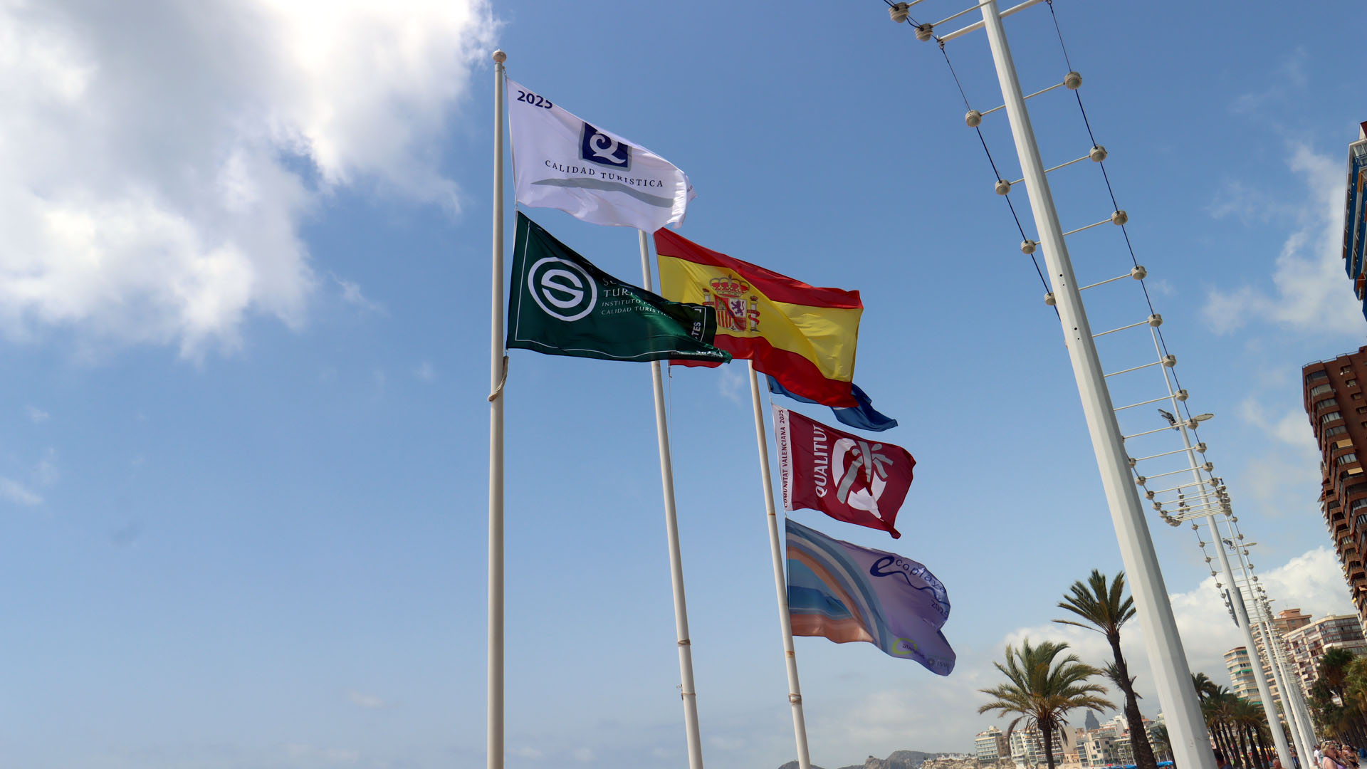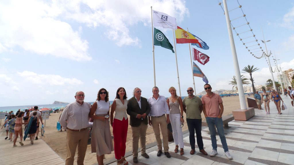 Las playas de Levante, Poniente y Mal Pas de Benidorm ya lucen las banderas ‘Q’ de Calidad, ‘S’ de Sostenibilidad Turística y ‘Safe Tourism’ que otorga el Instituto para la Calidad Turística Española y Sostenibilidad (ICTES). Los nueve distintivos han sido entregados este mediodía en un acto celebrado en la playa de Levante con presencia del alcalde, Toni Pérez; el presidente del ICTES, Miguel Mirones; la concejal de Playas, Mónica Gómez; el director general del Instituto, Fernando Fraile; y varios miembros de la corporación local.