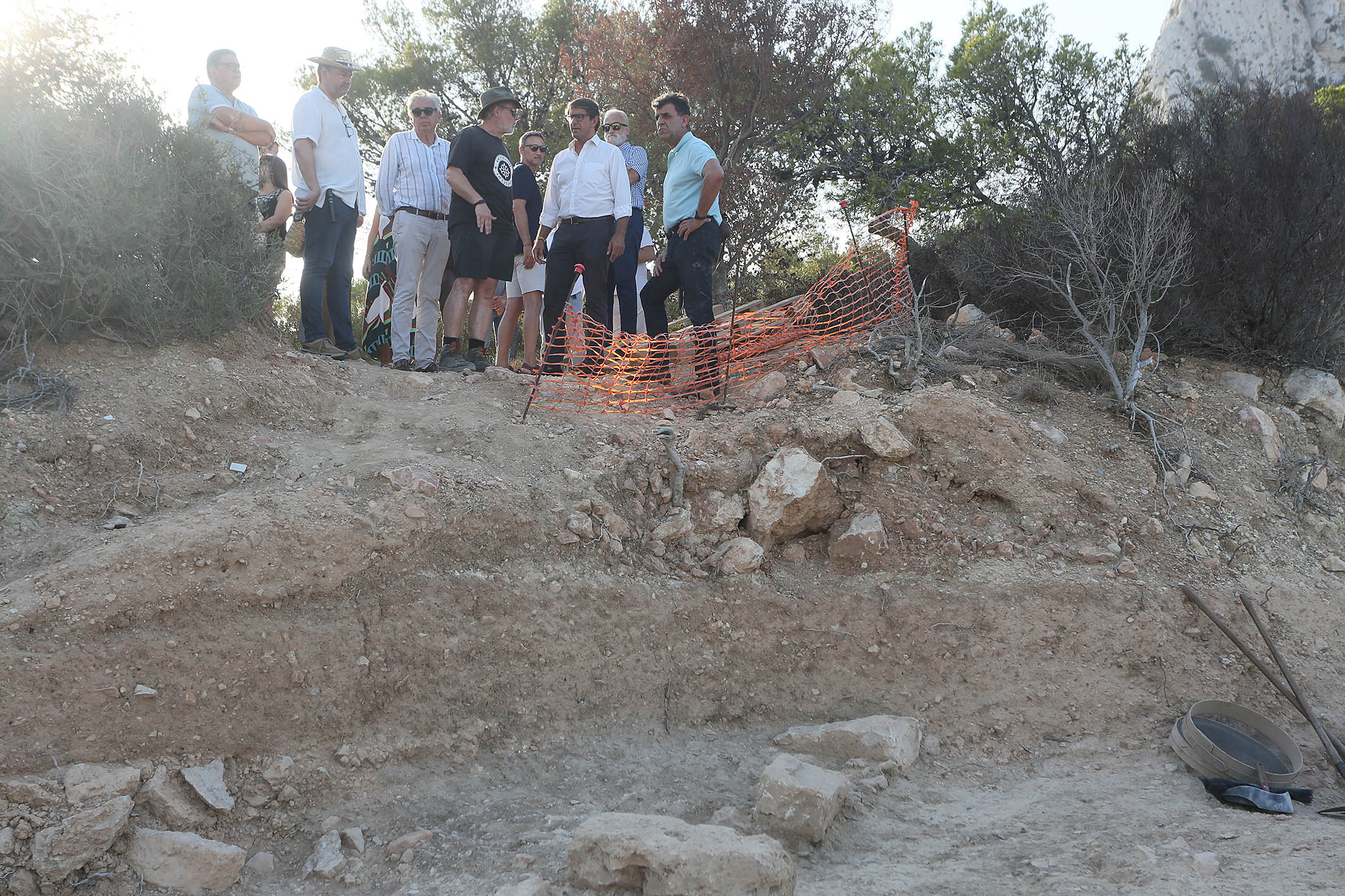 El diputado de Cultura, Juan de Dios Navarro, ha visitado esta mañana el enclave arqueológico, situado en las laderas del Parque Natural del Peñón de Ifach, para conocer de primera mano los pormenores de esta campaña que tiene una duración de cinco semanas. Acompañado por el concejal de Medio Ambiente de Calpe, Juan Manuel del Pino, y por el director del MARQ y coordinador de la Campaña, Manuel Olcina, el responsable provincial ha recorrido el enclave en el que desde hace cuatro semanas trabaja un equipo de profesionales bajo la dirección de José Luis Menéndez, especialista en arqueología medieval y técnico de exposiciones del museo alicantino.