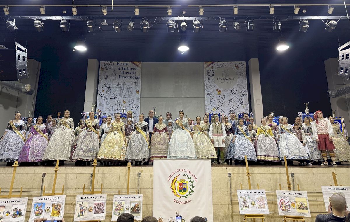 Las Falleras Mayor e Infantil de Benaguasil, Jessica Condes y Celeste Navarro, junto con el presidente infantil Aitor Tarin y, sus cortes de honor, fueron las encargadas de recibir a los representantes de las 10 fallas que hay en Benaguasil. Una vez en el escenario cada comisión comentó los diferentes lemas de sus monumentos grandes e infantiles, destacando sus características más peculiares, la temática, etc, de los bocetos que cobrarán vida en poco más de tres meses.