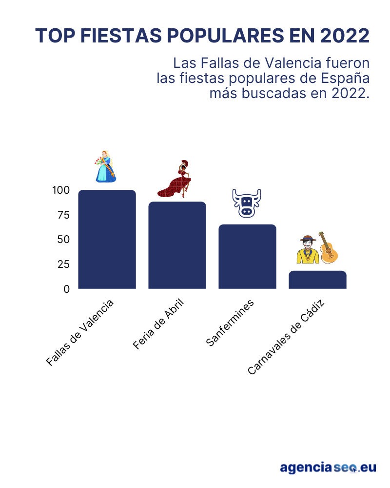 Las Fallas fueron en 2022 las fiestas populares nacionales más buscadas en Google por los españoles, seguidas de la Feria de Abril, los Sanfermines o el Carnaval de Cádiz, y el interés de los internautas sigue al alza en 2023, según el estudio realizado por la empresa de posicionamiento agenciaseo.eu para el Clúster de Empresas Innovadoras para el Turismo de la Comunitat Valenciana (Adestic) sobre el interés de las fiestas falleras en internet.