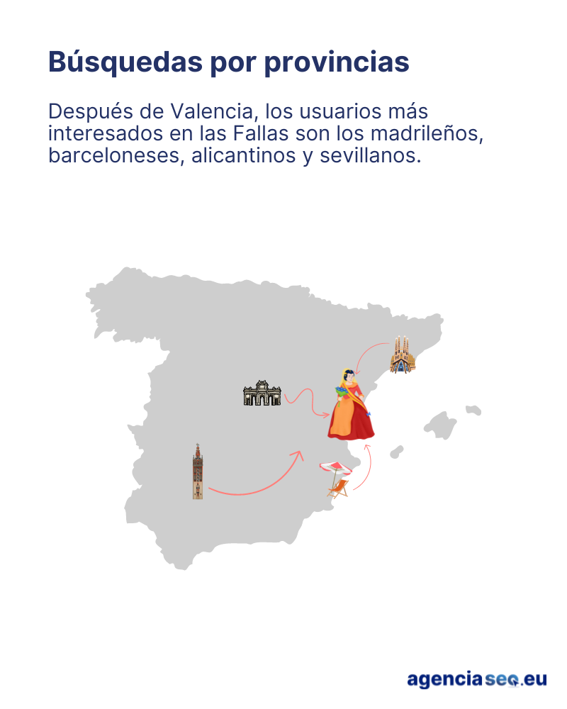 Además, las tendencias de búsqueda apuntan a que lo que más interesa a los posibles visitantes son, por este orden, las mascletás, las fechas de las Fallas, la Nit del Foc, los conciertos de Fallas, qué fallas ver en Valencia y la cremà, según el informe de agenciaseo.eu.
