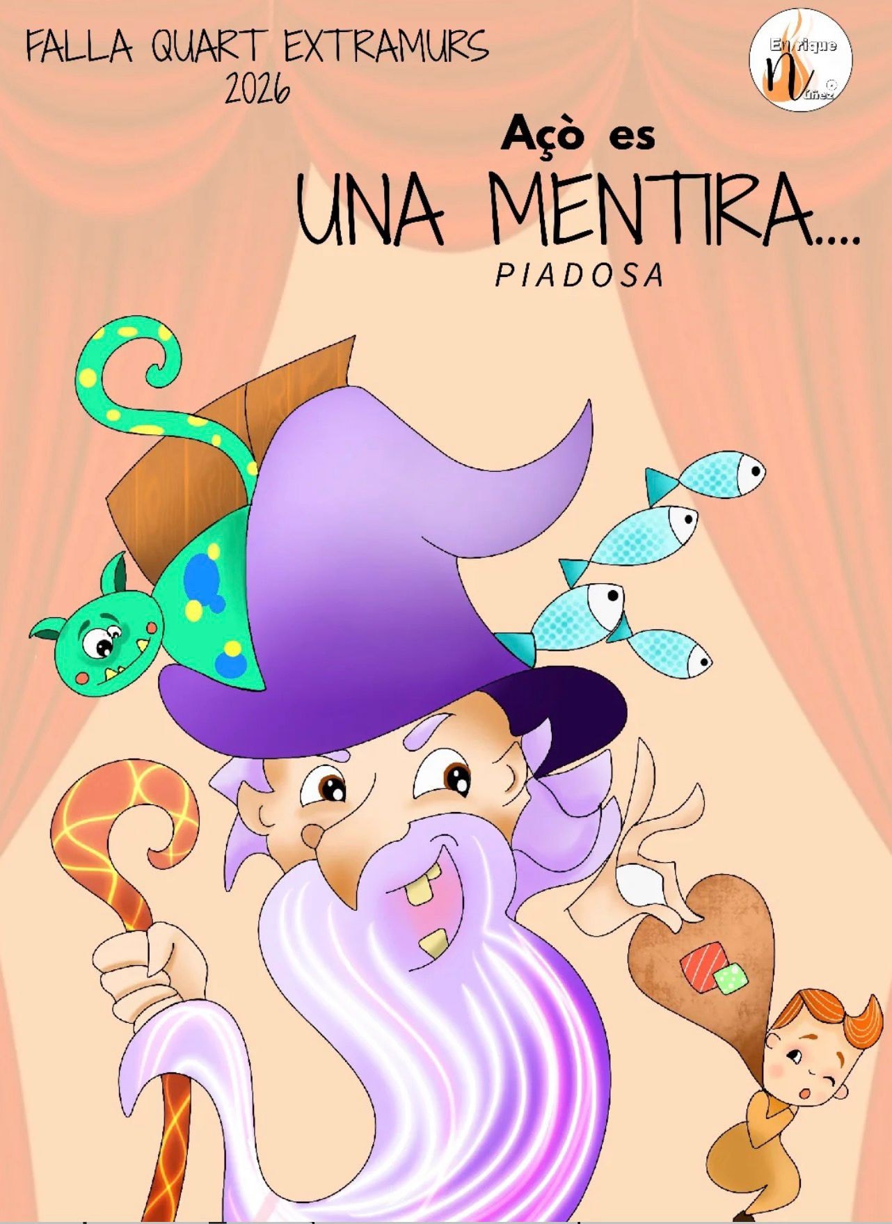 El boceto de la falla grande la podrás encontrar aquí junto a las Fallas de la Federación de Fallas 1ªA. La falla infantil militará en la Sección 7ª y su artista es El Taller de Enrique Núñez con el lema Açò es una mentira…piadosa.