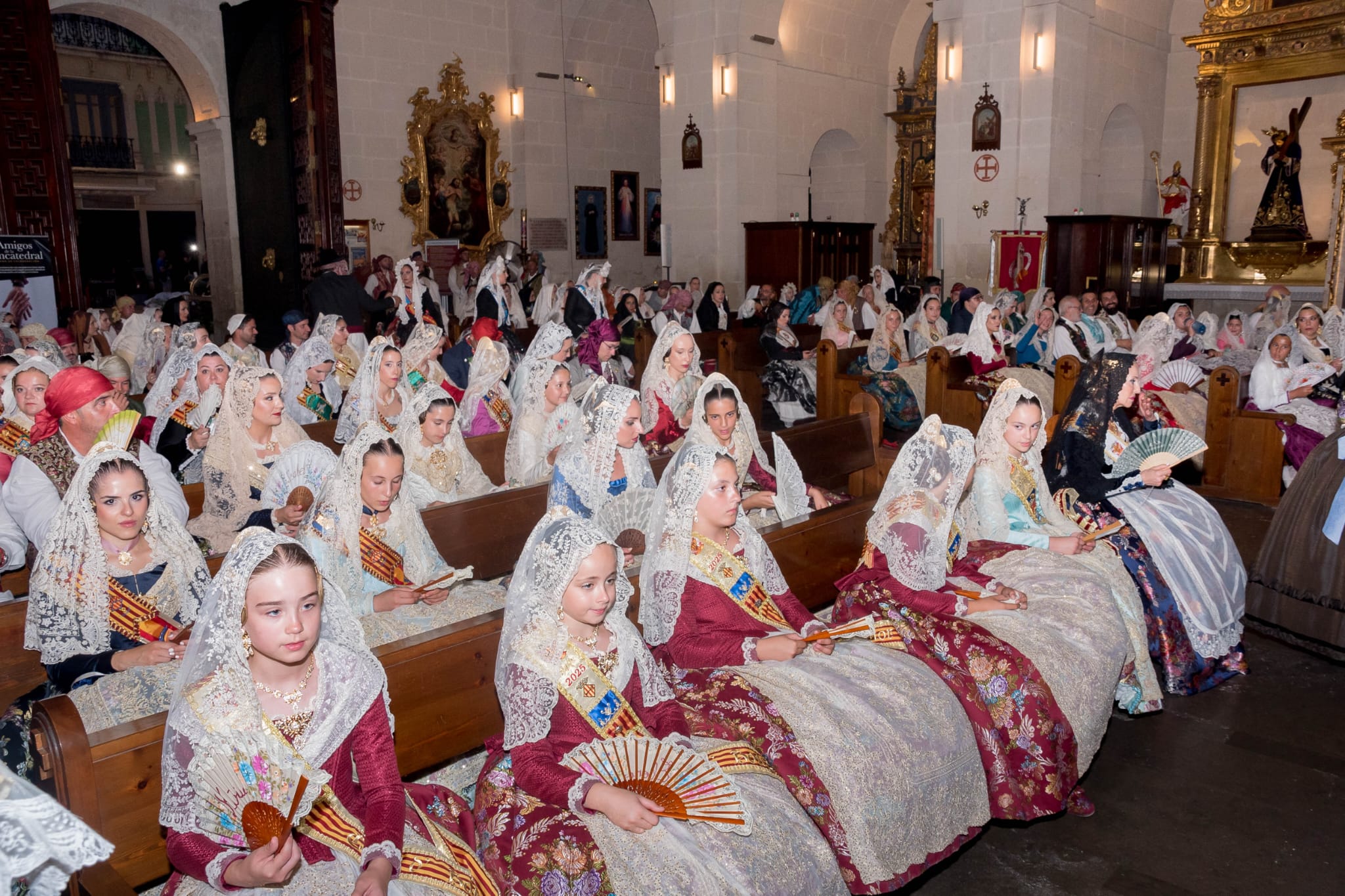 La comitiva de FJFS ofrendó a las puertas de la Concatedral de San Nicolás y pudo asistir a la ofrenda floral que se realizó en su interior por parte de la “Bellesa del Foc Infantil” 2025, Valentina Tárraga y su corte de honor, así como de la Fallera Mayor infantil de València, Lucía García.