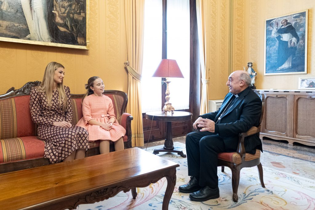 El arzobispo de Valencia, monseñor Enrique Benavent, ha mantenido este jueves un encuentro con la Fallera Mayor de Valencia 2025, Berta Peiró García, y la Fallera Mayor Infantil 2025, Lucía García Rivera, en el Palacio Arzobispal.