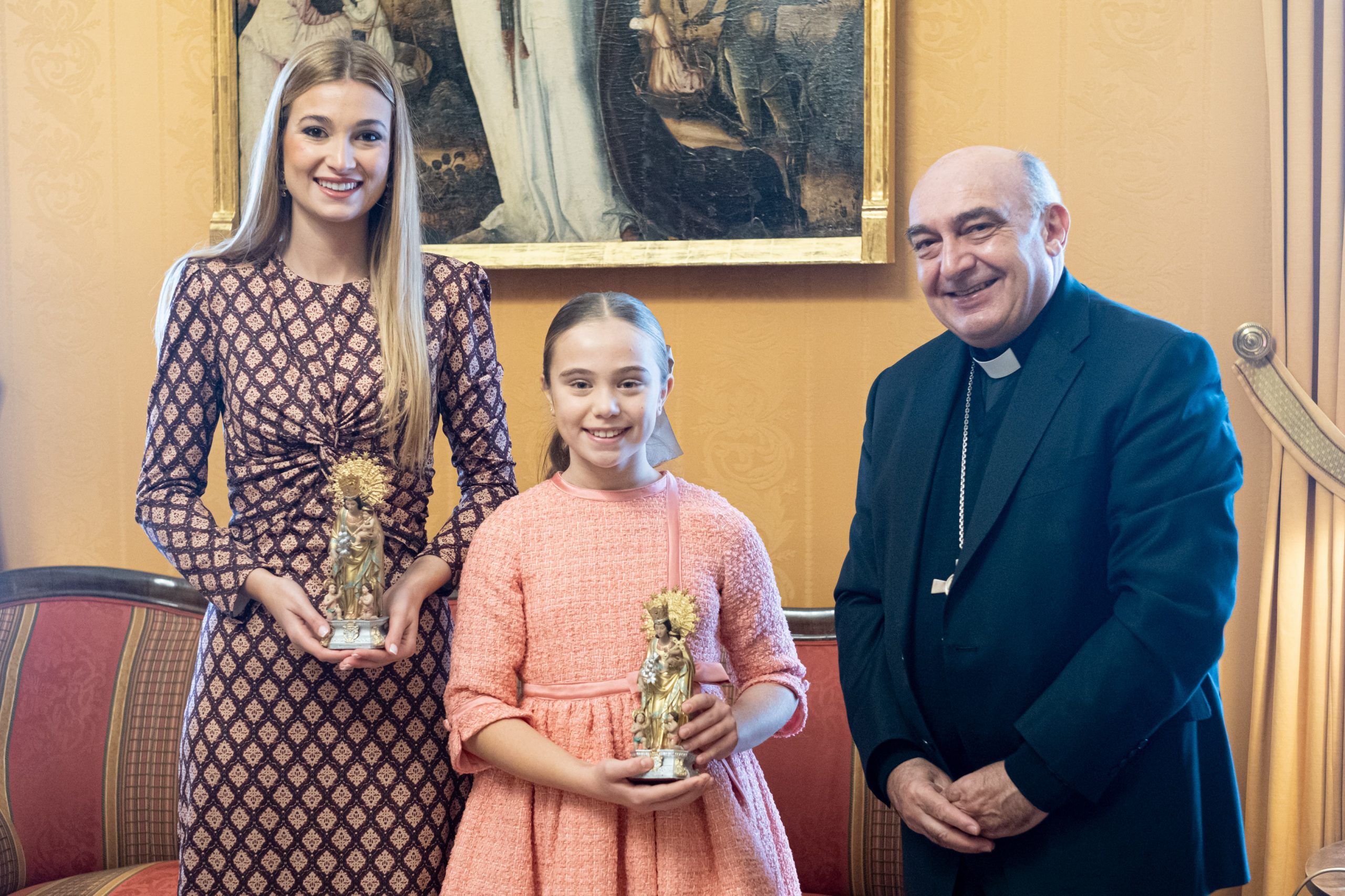 En la audiencia, el Arzobispo ha obsequiado a las Falleras Mayores con una imagen de la Virgen de los Desamparados, y ellas le han entregado una pieza de edición limitada creada por el artista Sergio Amar, cuya figura representa el futuro de la fiesta de las fallas, realizada en resina pintada y lacada a mano, en agradecimiento por la recepción.