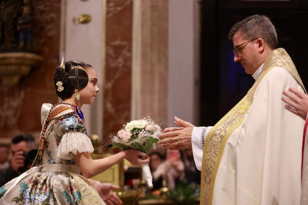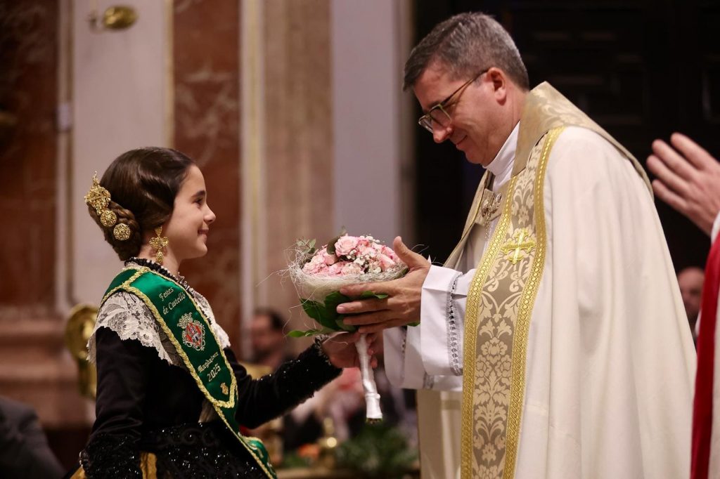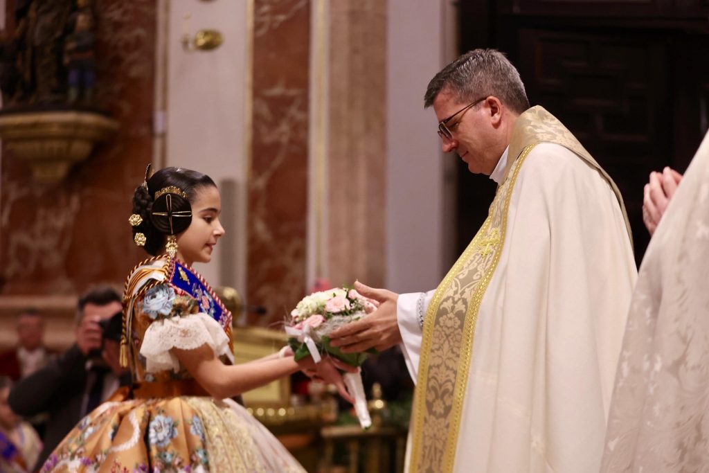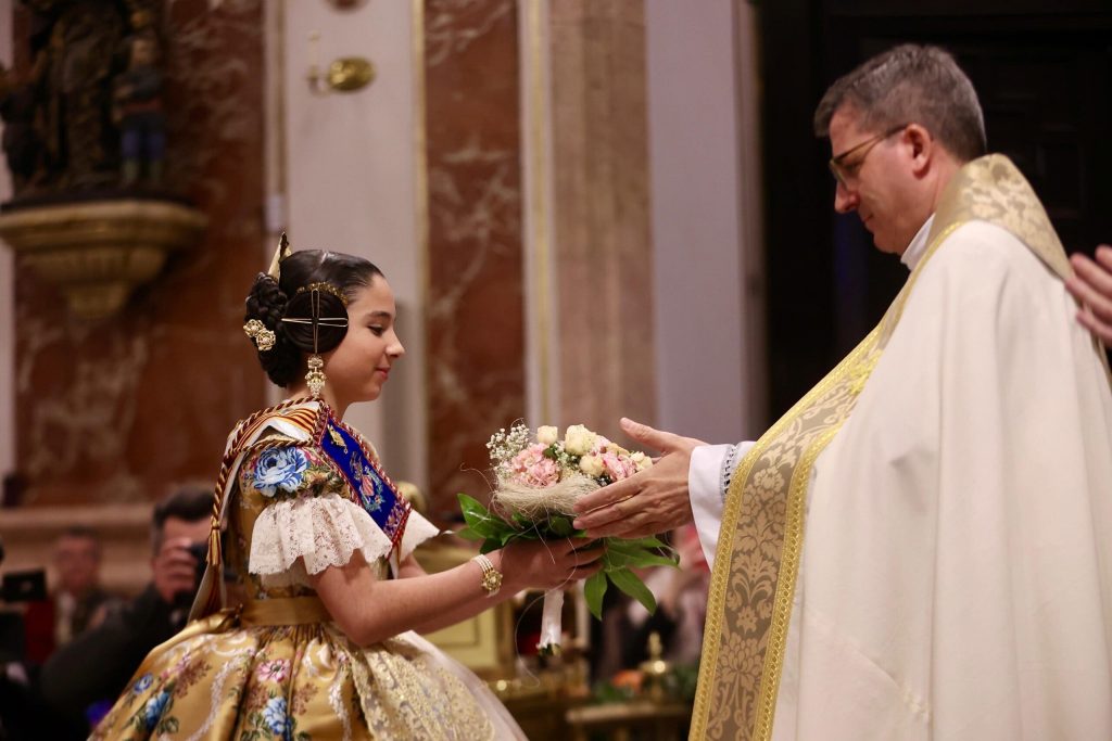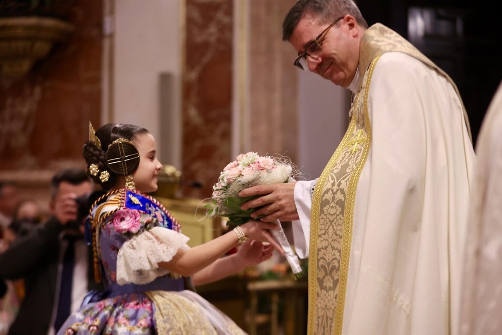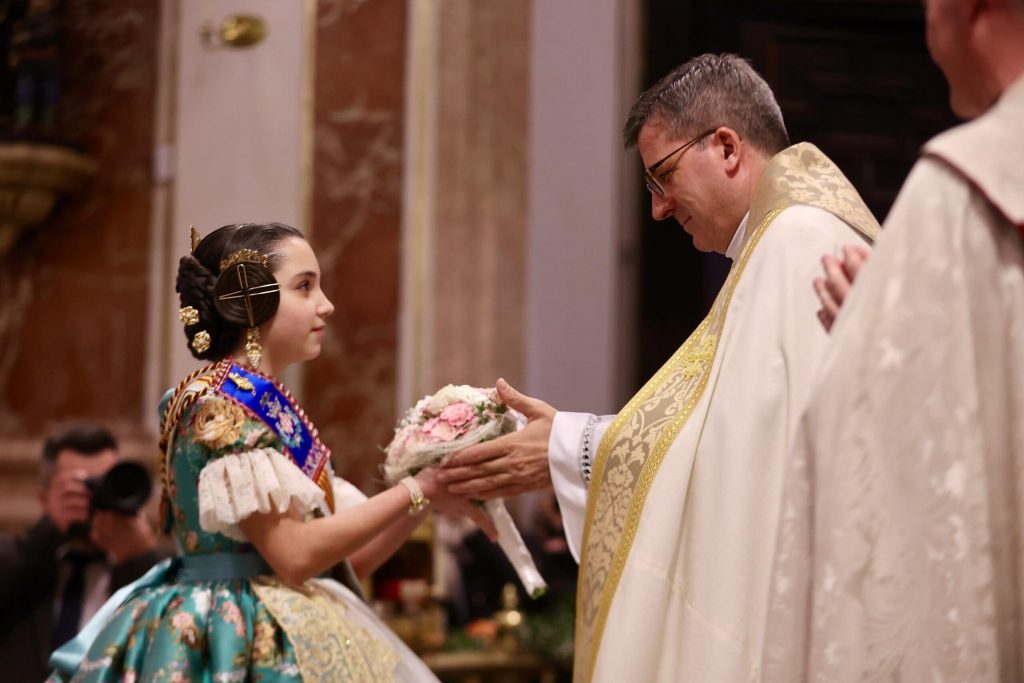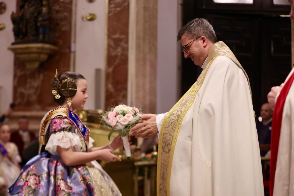 La Ofrenda de flores en la Basílica se puso anoche el broche de oro a las Exaltaciones de Berta, Lucía y las Cortes de Honor, y allí a los pies de la Geperudeta, las máximas representantes han podido vivir un cierre íntimo y emocionante de este momento especial. Fueron recibidas por el rector de la Basílica, Melchor Seguí y por el vicerrector, Álvaro Almenar.