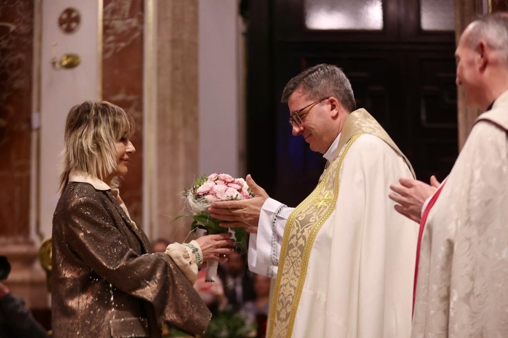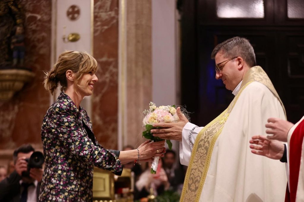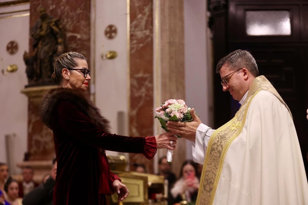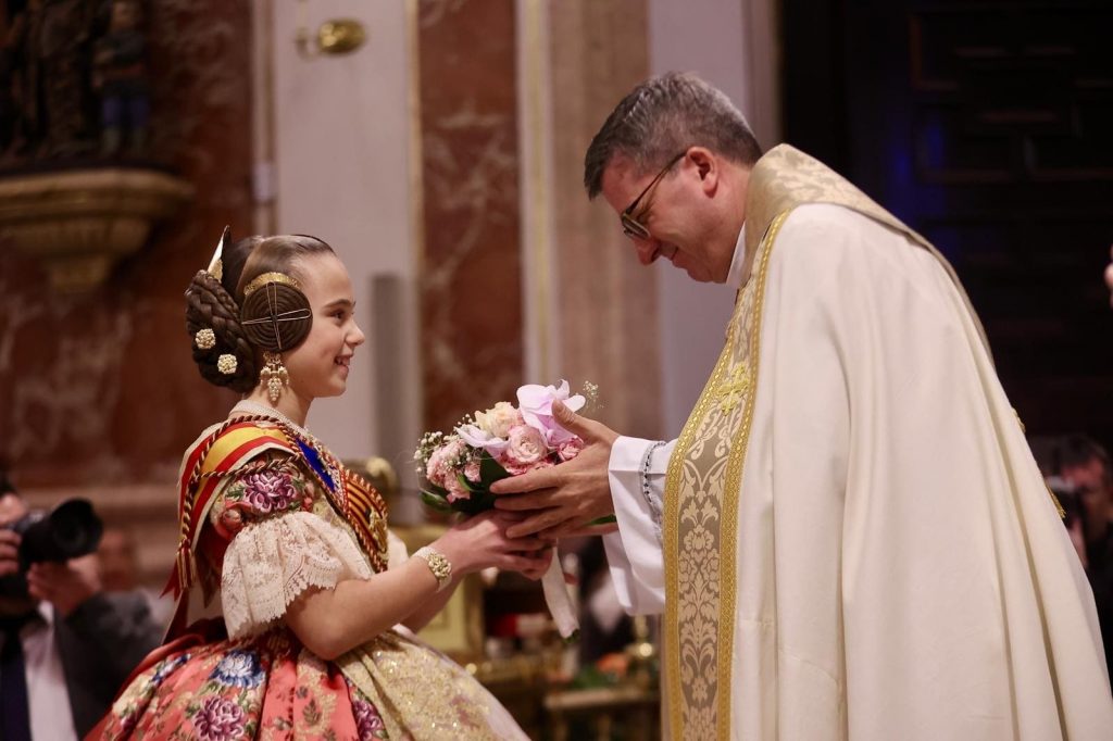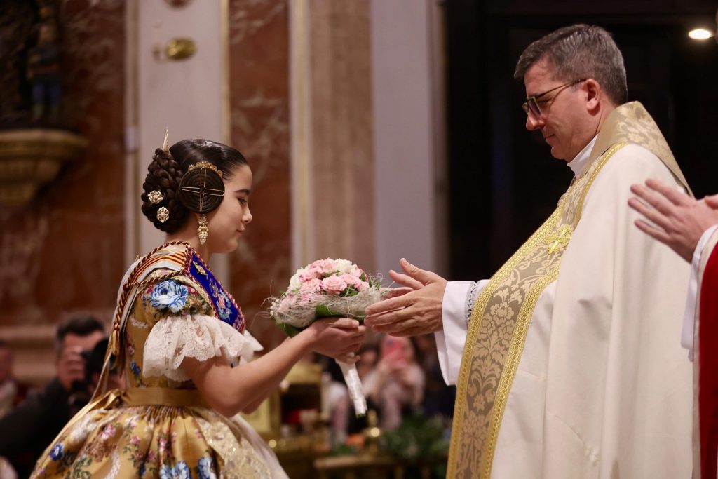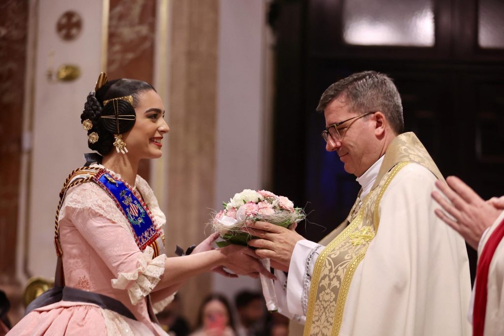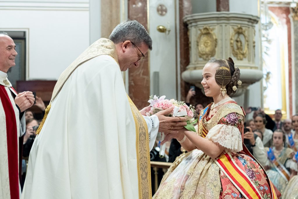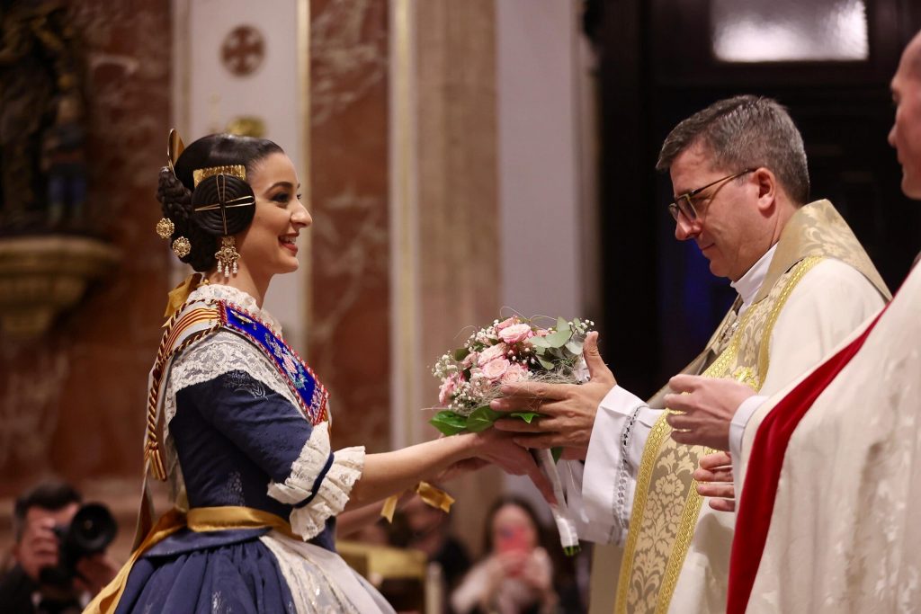 La Ofrenda de flores en la Basílica se puso anoche el broche de oro a las Exaltaciones de Berta, Lucía y las Cortes de Honor, y allí a los pies de la Geperudeta, las máximas representantes han podido vivir un cierre íntimo y emocionante de este momento especial. Fueron recibidas por el rector de la Basílica, Melchor Seguí y por el vicerrector, Álvaro Almenar.