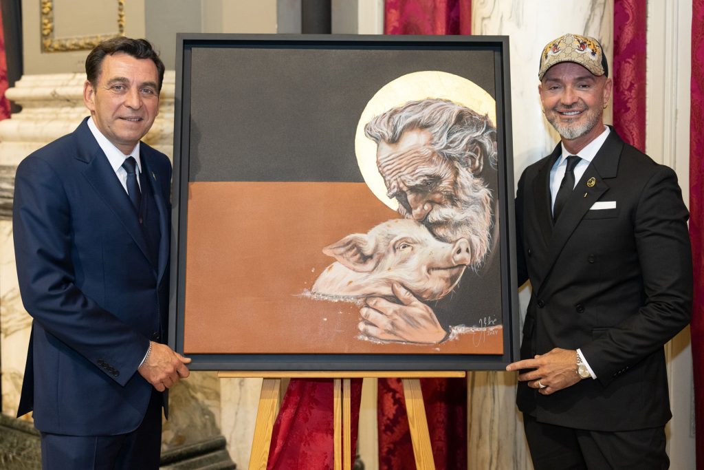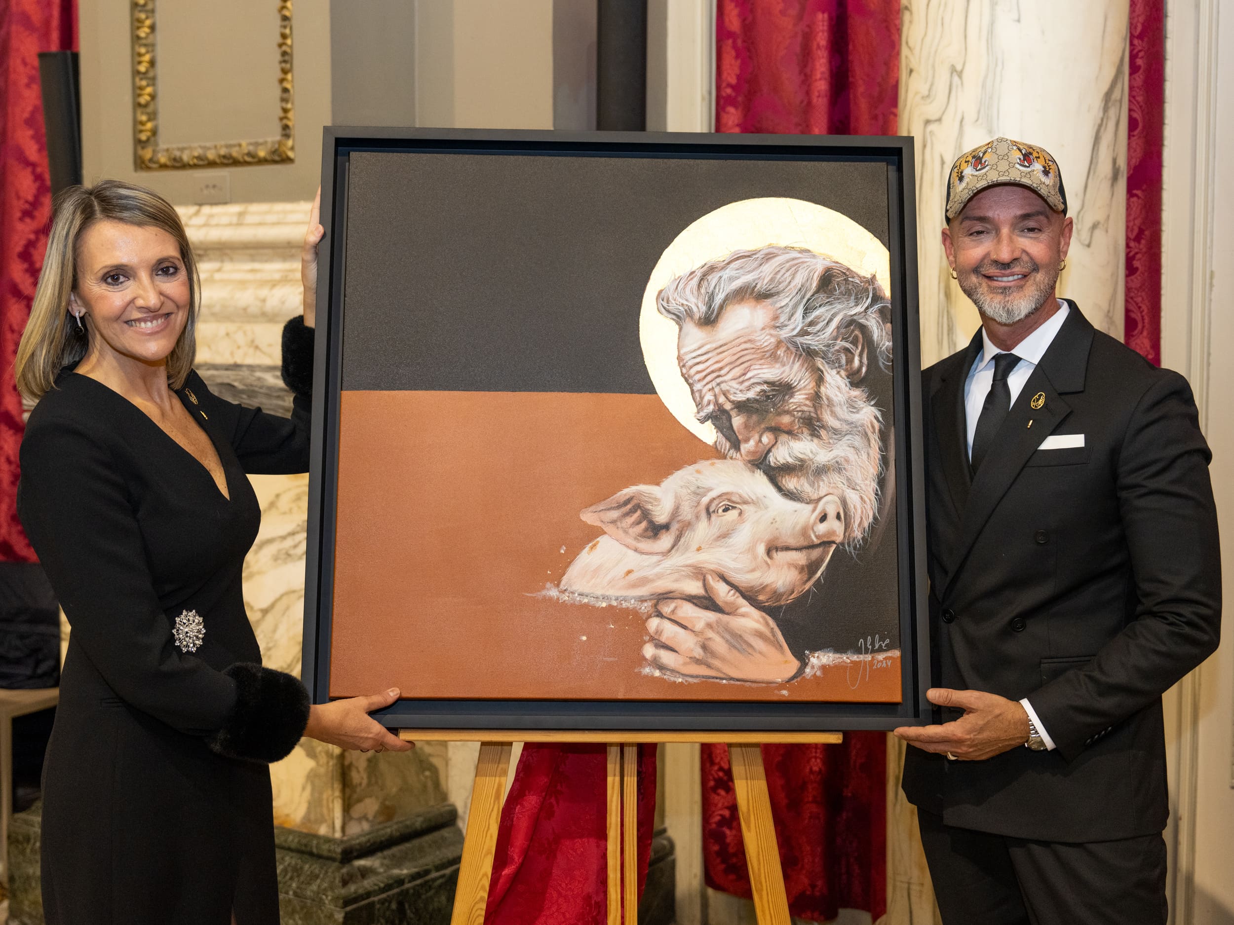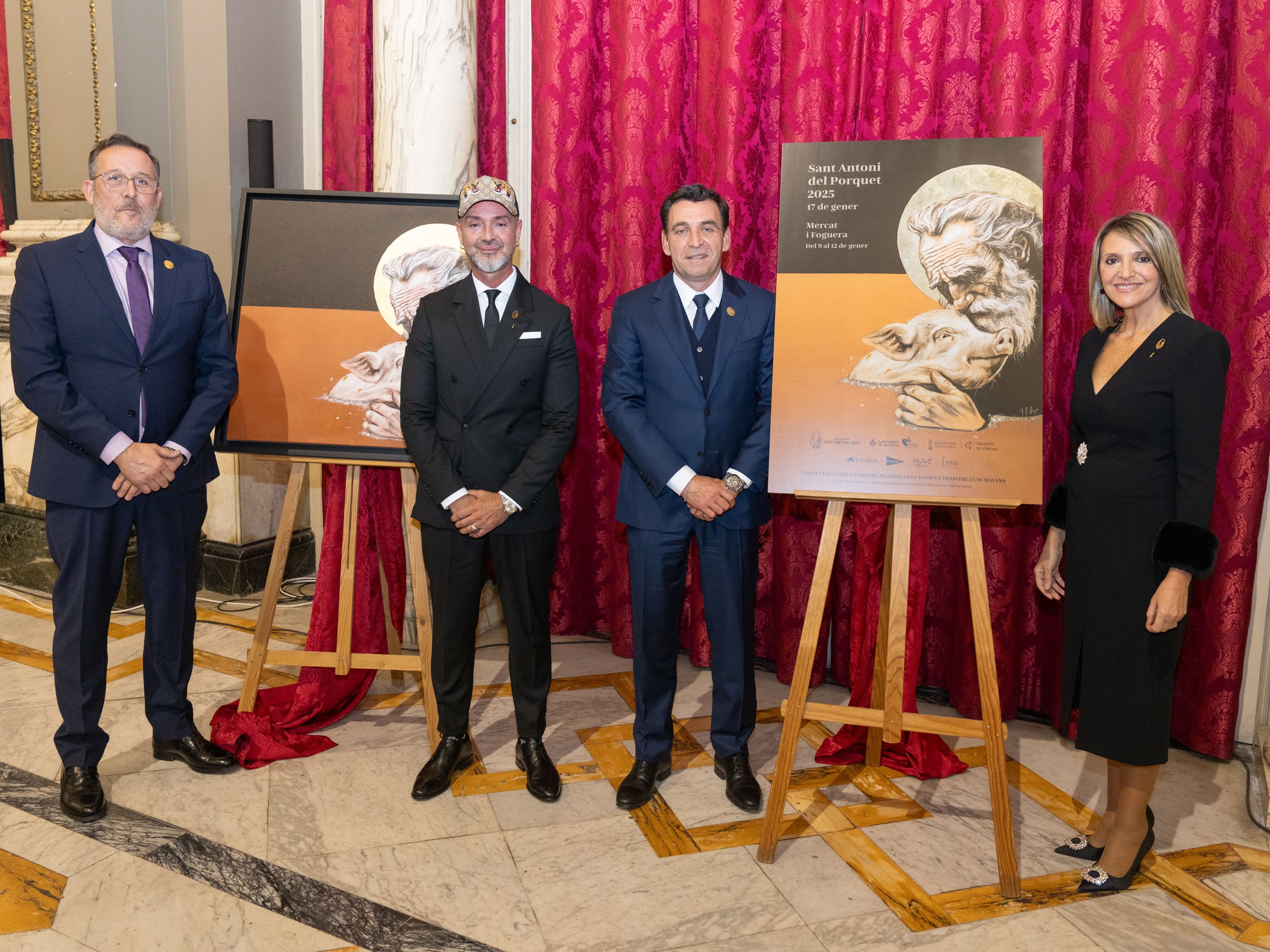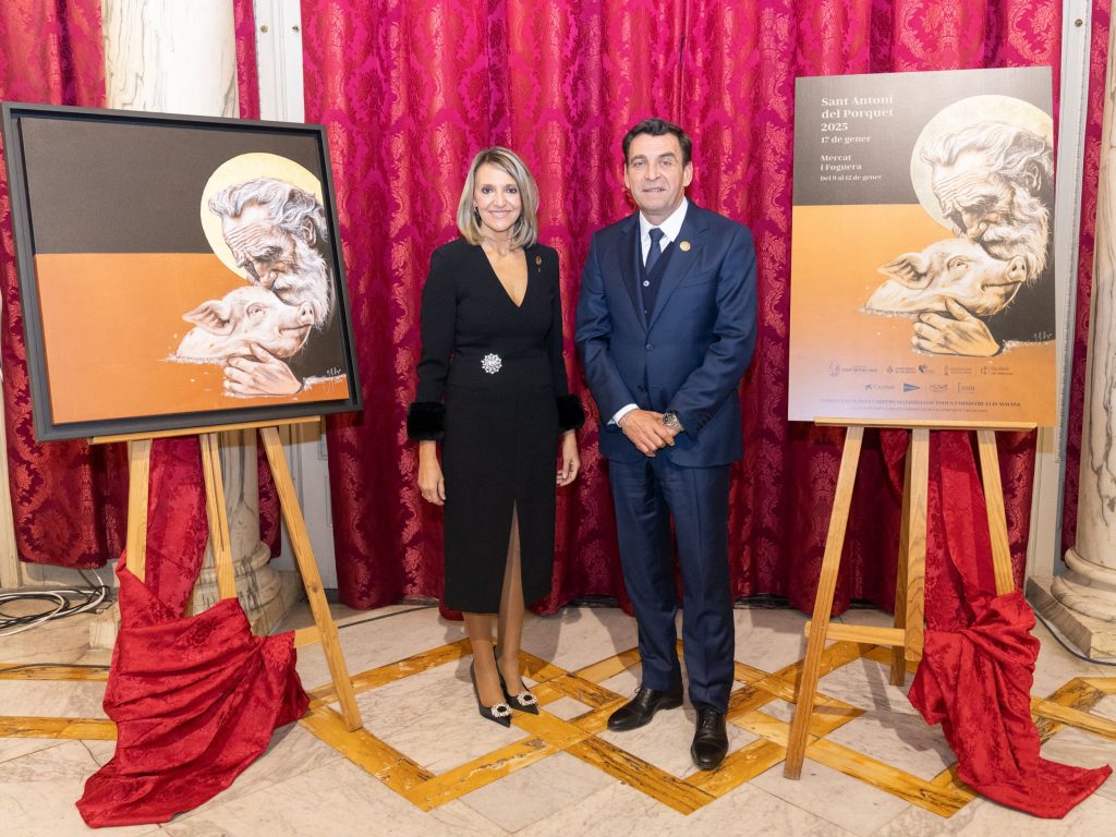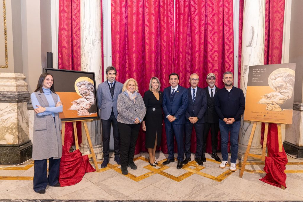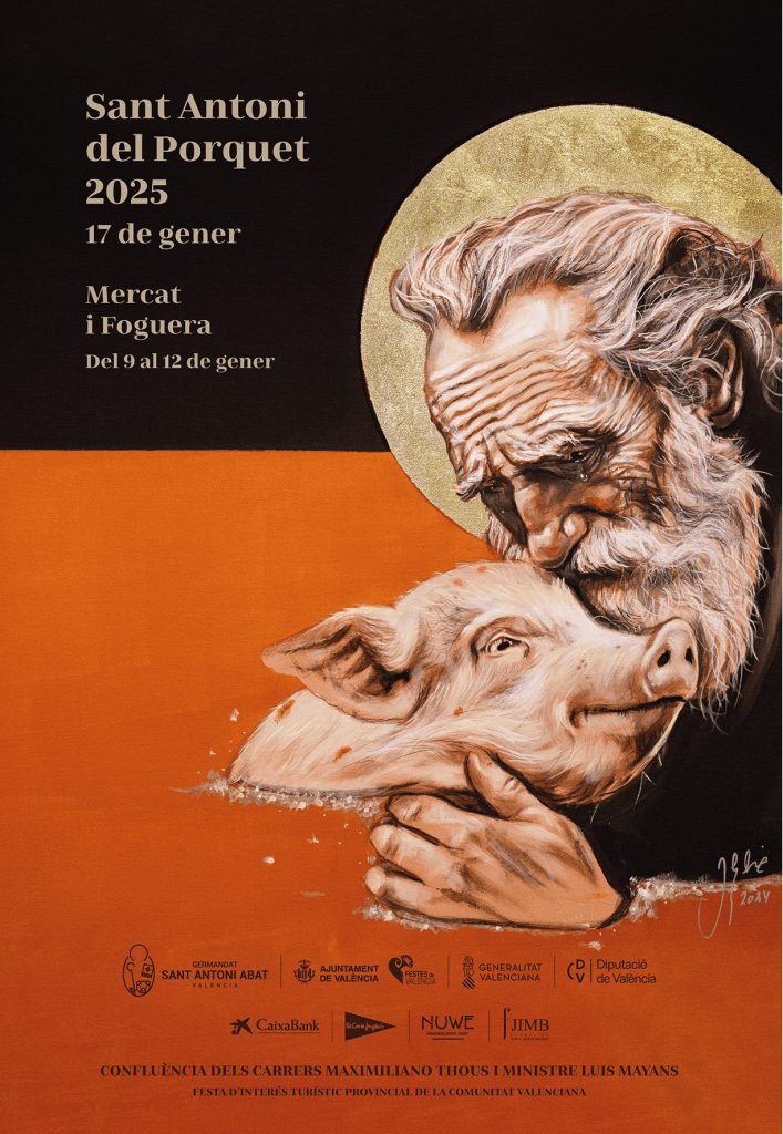 Durante el acto, se presentó el cartel oficial de las Fiestas de San Antonio Abad 2025, una obra del destacado artista Jesús Arrúe, conocido como «el pintor de las miradas» por su capacidad para capturar emociones y reflejarlas en sus creaciones. Este año, la imagen del cartel tiene un profundo significado, ya que rinde homenaje a la tragedia de la DANA, representando a un San Antonio Abad salvando a su icónica figura del cerdo, símbolo inseparable de su imagen tradicional. La obra, con su magistral uso de la luz y el color, no solo captura el espíritu de las celebraciones, sino que también transmite un poderoso mensaje de esperanza y resiliencia ante la adversidad.