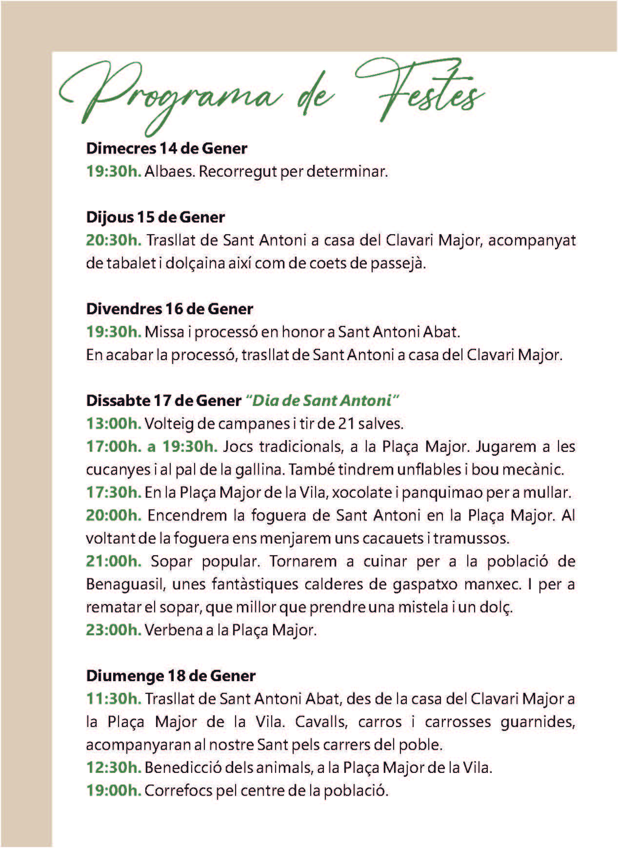 Benaguasil celebrará la festividad en honor a San Antonio Abad, patrón de los animales y conocido popularmente como Sant Antoni del Porquet, del sábado 14 al domingo 18 de enero. Los actos darán comienzo el día 14 con el tradicional canto de albaes por las casas de antiguos clavarios, finalizando en el domicilio del actual clavario mayor, Luis Balaguer.