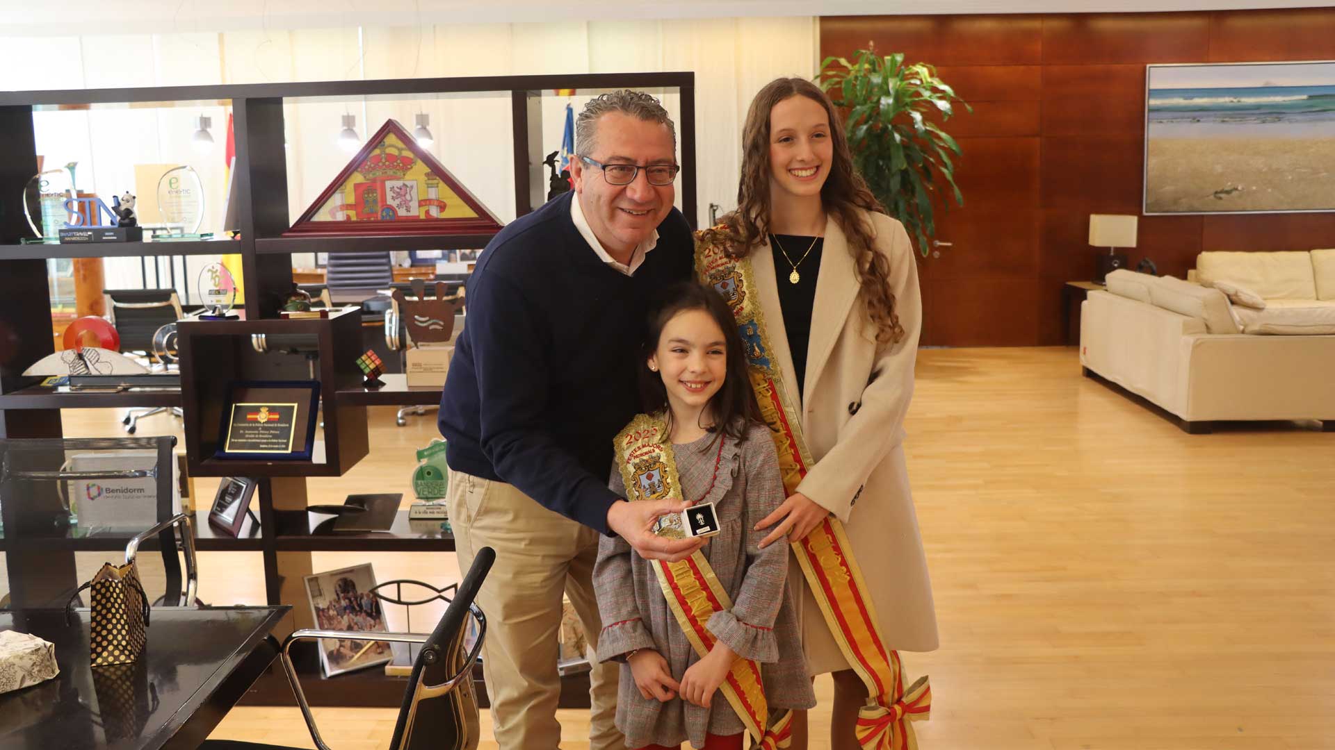 El alcalde de Benidorm, Toni Pérez, ha recibido este jueves oficialmente a las nuevas reinas de les Festes Majors Patronals de la ciudad para el año 2025, la joven Paula Pascual Sánchez y la niña Aitana Pérez Gutiérrez, en el despacho de Alcaldía. Las dos reinas han estado acompañadas por la concejal de Fiestas, Mariló Cebreros, y la la presidenta de la Comissió, Susana Martínez.