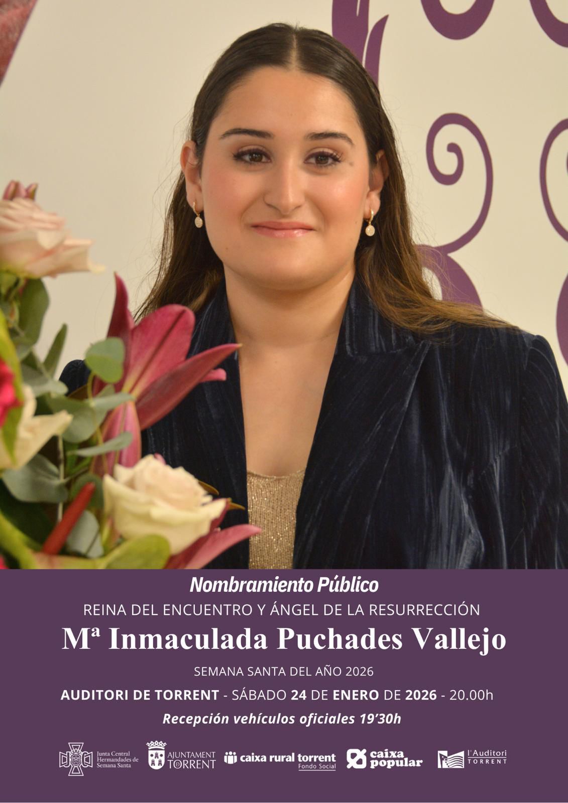 La Semana Santa de Torrent se pone oficialmente en marcha de cara a las celebraciones de la Pasión, Muerte y Resurrección de Cristo en 2026 con el acto del Nombramiento Público de la Reina del Encuentro y Ángel de la Resurrección 2026, Inmaculada Puchades Vallejo, que tendrá lugar este sábado 24 de enero en el Auditori de Torrent.