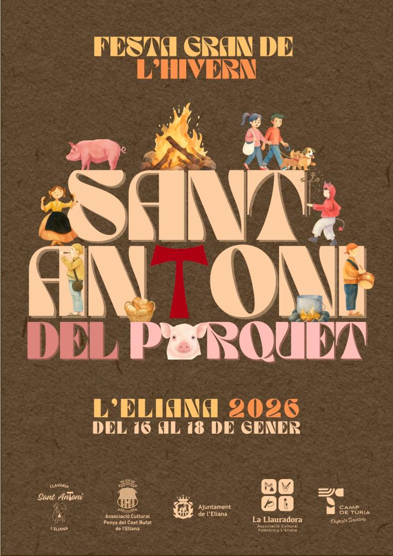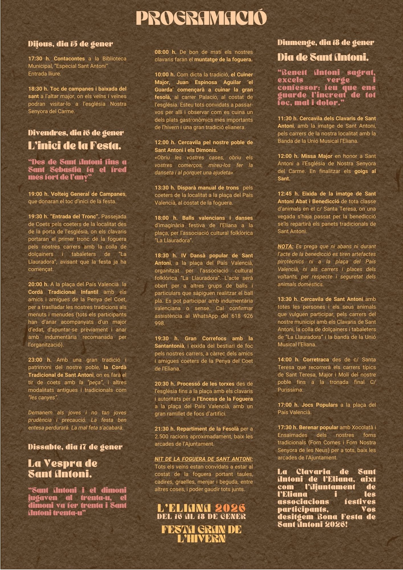El diumenge, dia de Sant Antoni, tindrà lloc la cercavila amb la banda de la Unió Musical l’Eliana, la missa major, la tradicional benedicció dels animals i el repartiment de més de 3.000 panets. El corretraca recorrerà els carrers més emblemàtics del municipi, mentre que els jocs populars i el berenar popular de xocolate i repartiment de 4.000 ensaïmades posaran el punt final a la programació.